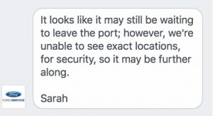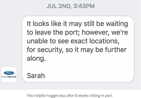 “It has now been 10 weeks since my car has been unloaded and I don’t have it. I don’t know what it’s doing at the docks. Ford won’t tell me. I don’t know when it will be delivered. Ford won’t tell me. Ford told all RS owners to start contacting Ford Service on Facebook (seriously), who are outsourced customer support who read off scripts.”