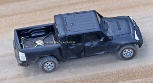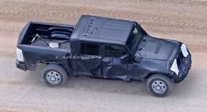 The prototype you see here is wearing the four-door Unlimited body with a fairly sizeable bed hanging at the rear. Judging though by the placement of the rear wheels inside the wheel wells, we can safely assume that this is not going to be the final design, though.