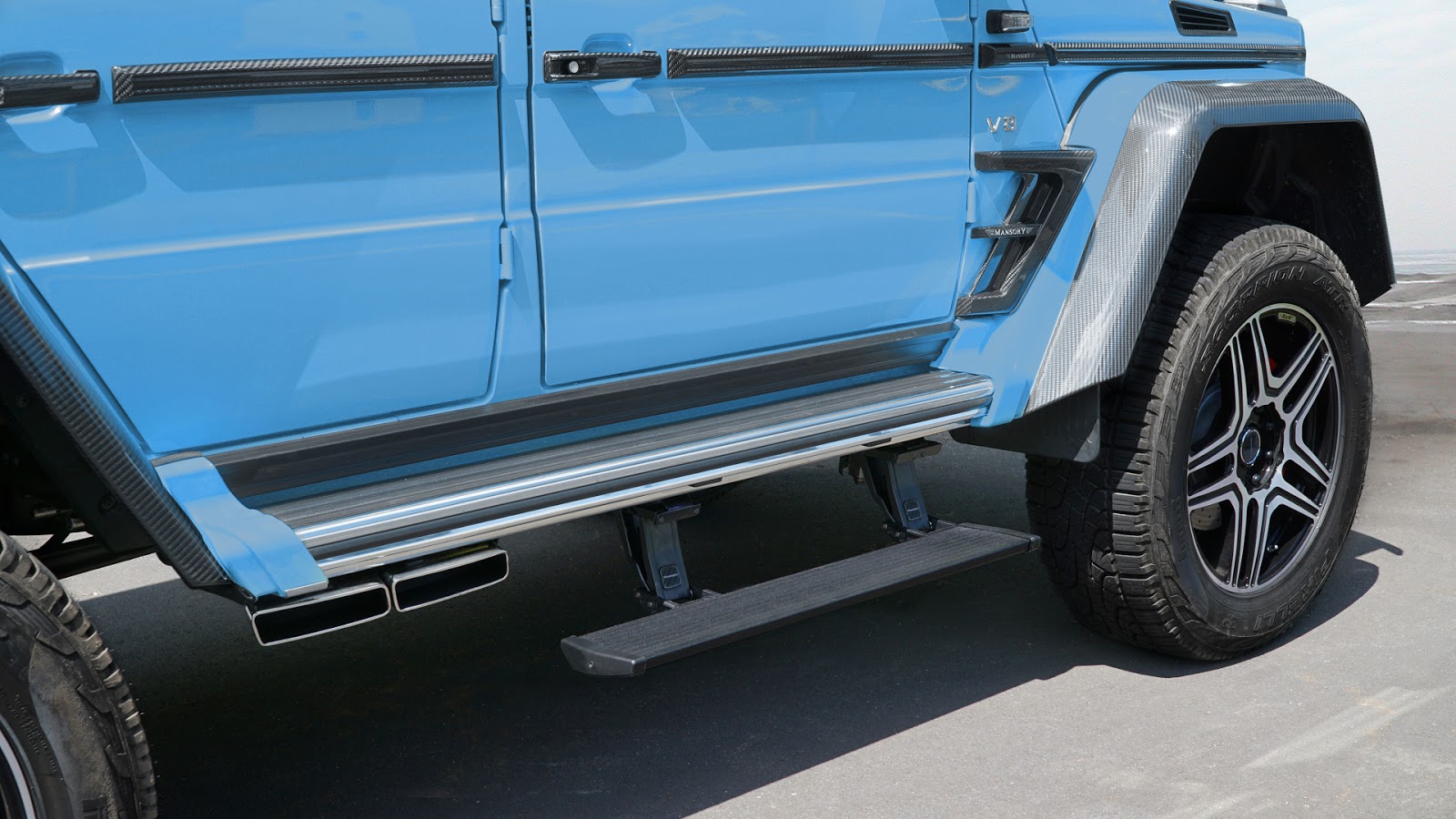 The carbon fiber parts continue across the sides with new wheel arches, door trim and door handles and a set of electric side steps. The rear is then completed with carbon taillight bezels and surprise surprise, carbon badging.