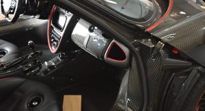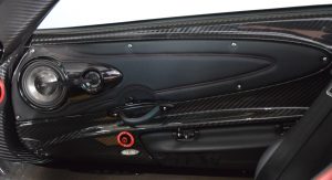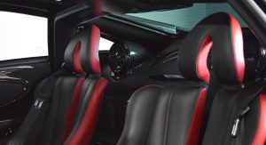 Listed on the Californian market, the entire exterior includes an exposed carbon fiber finish, an extremely expensive option offered by the marque. The grey carbon has then been offset thanks to red pinstripping across the body, wheels and the headlight surrounds. The cabin is just as special and combines blacked-out aluminum like the Huayra BC alongside carbon and the finest red and black leather.