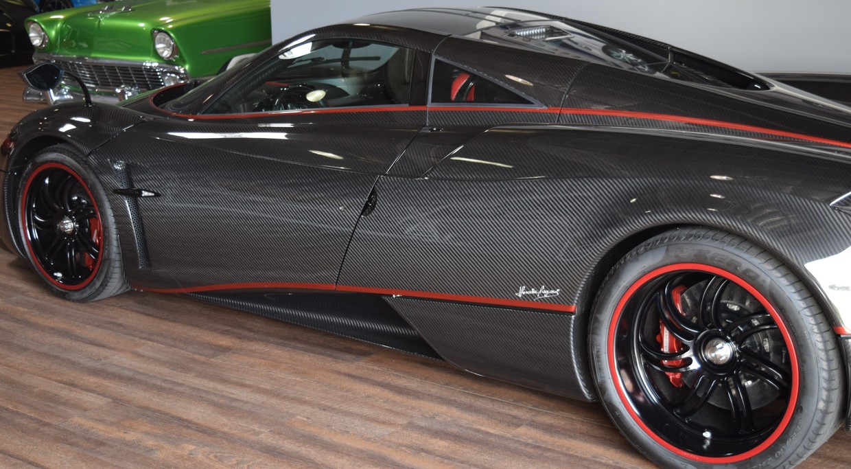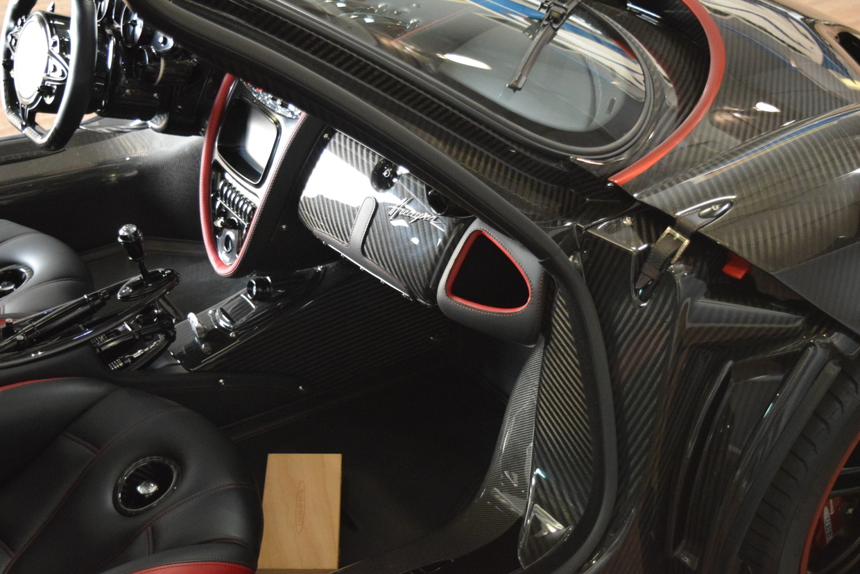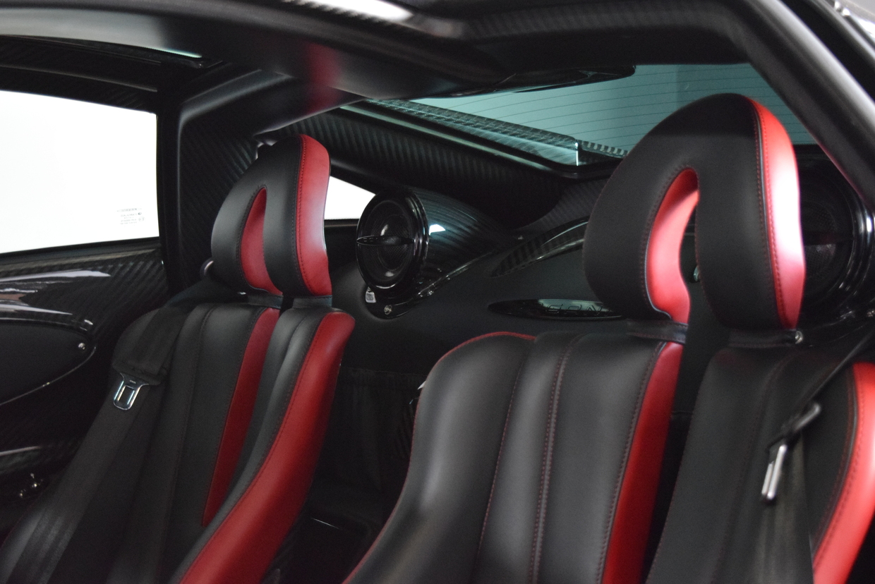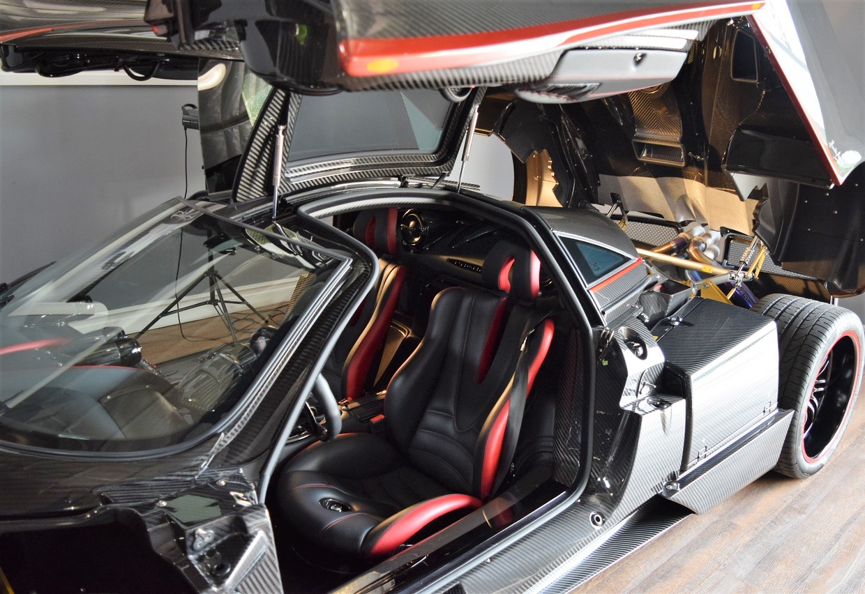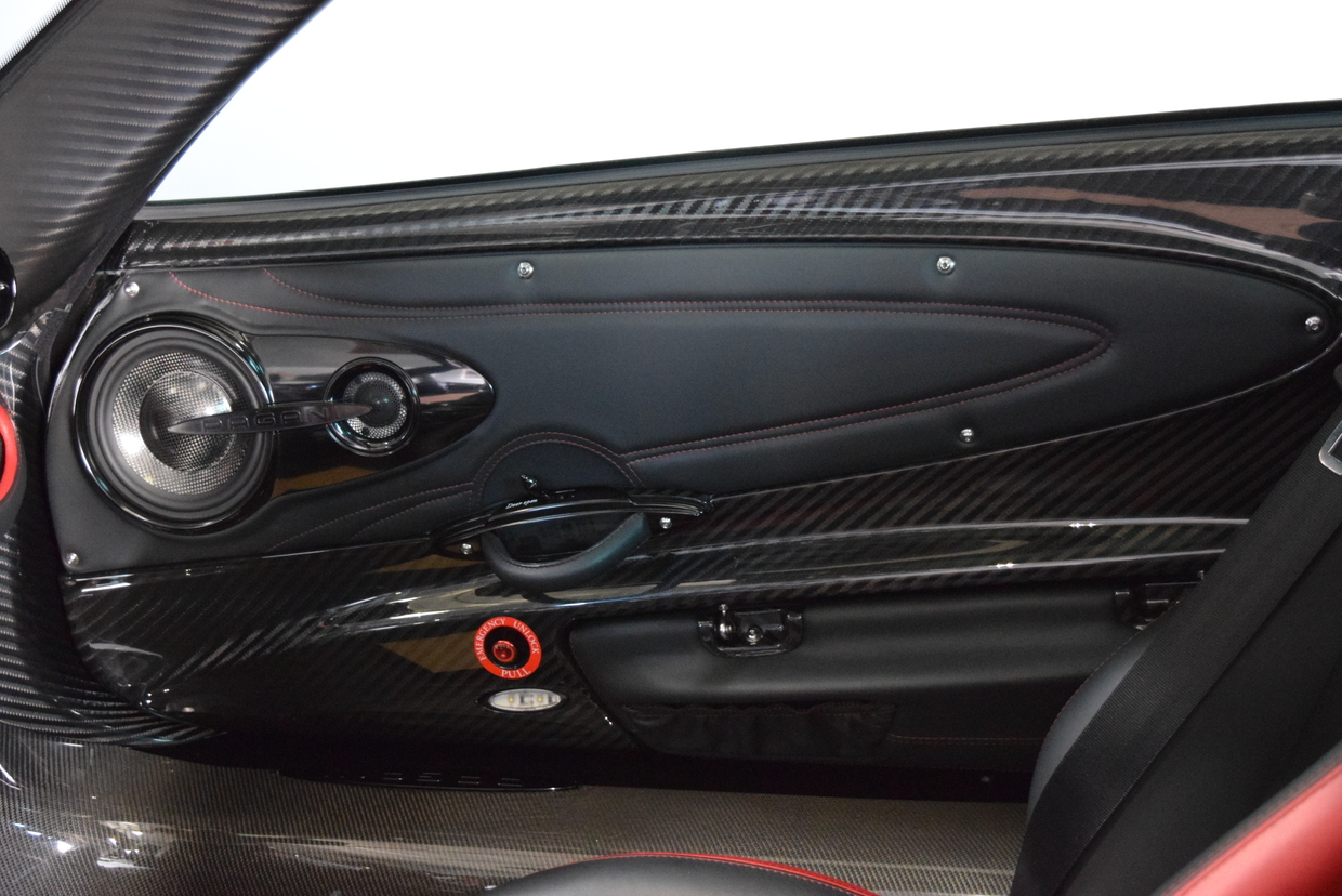 Listed on the Californian market, the entire exterior includes an exposed carbon fiber finish, an extremely expensive option offered by the marque. The grey carbon has then been offset thanks to red pinstripping across the body, wheels and the headlight surrounds. The cabin is just as special and combines blacked-out aluminum like the Huayra BC alongside carbon and the finest red and black leather.