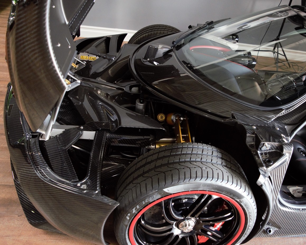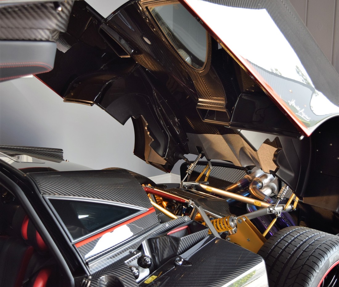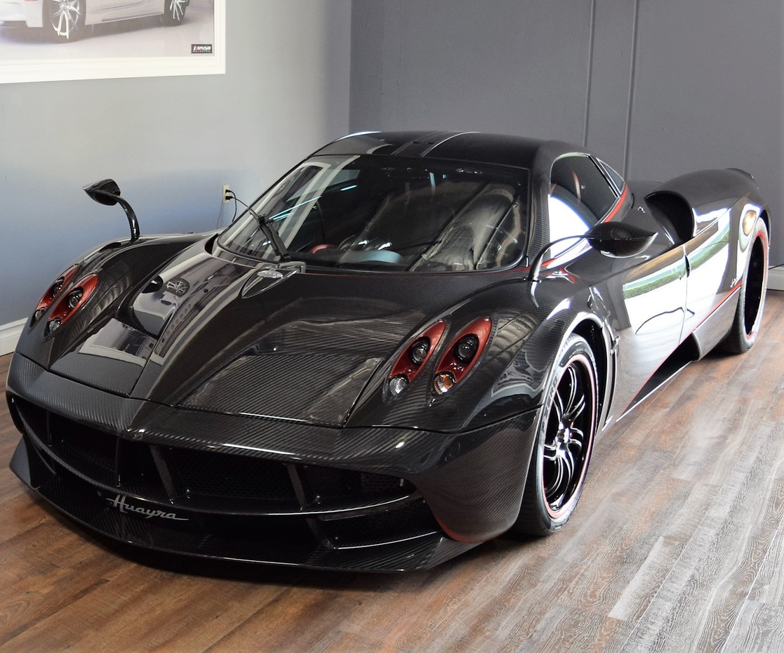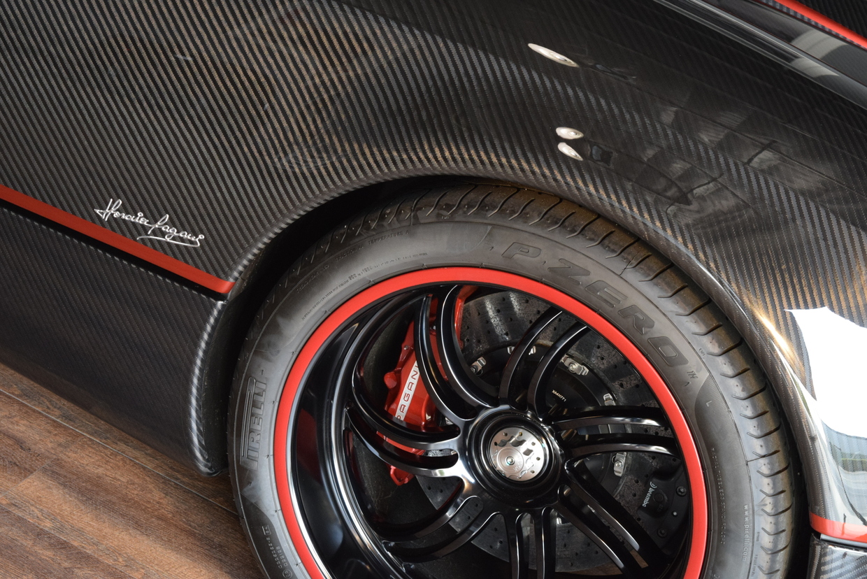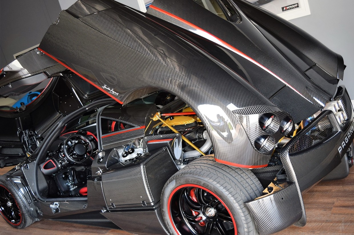 Listed on the Californian market, the entire exterior includes an exposed carbon fiber finish, an extremely expensive option offered by the marque. The grey carbon has then been offset thanks to red pinstripping across the body, wheels and the headlight surrounds. The cabin is just as special and combines blacked-out aluminum like the Huayra BC alongside carbon and the finest red and black leather.