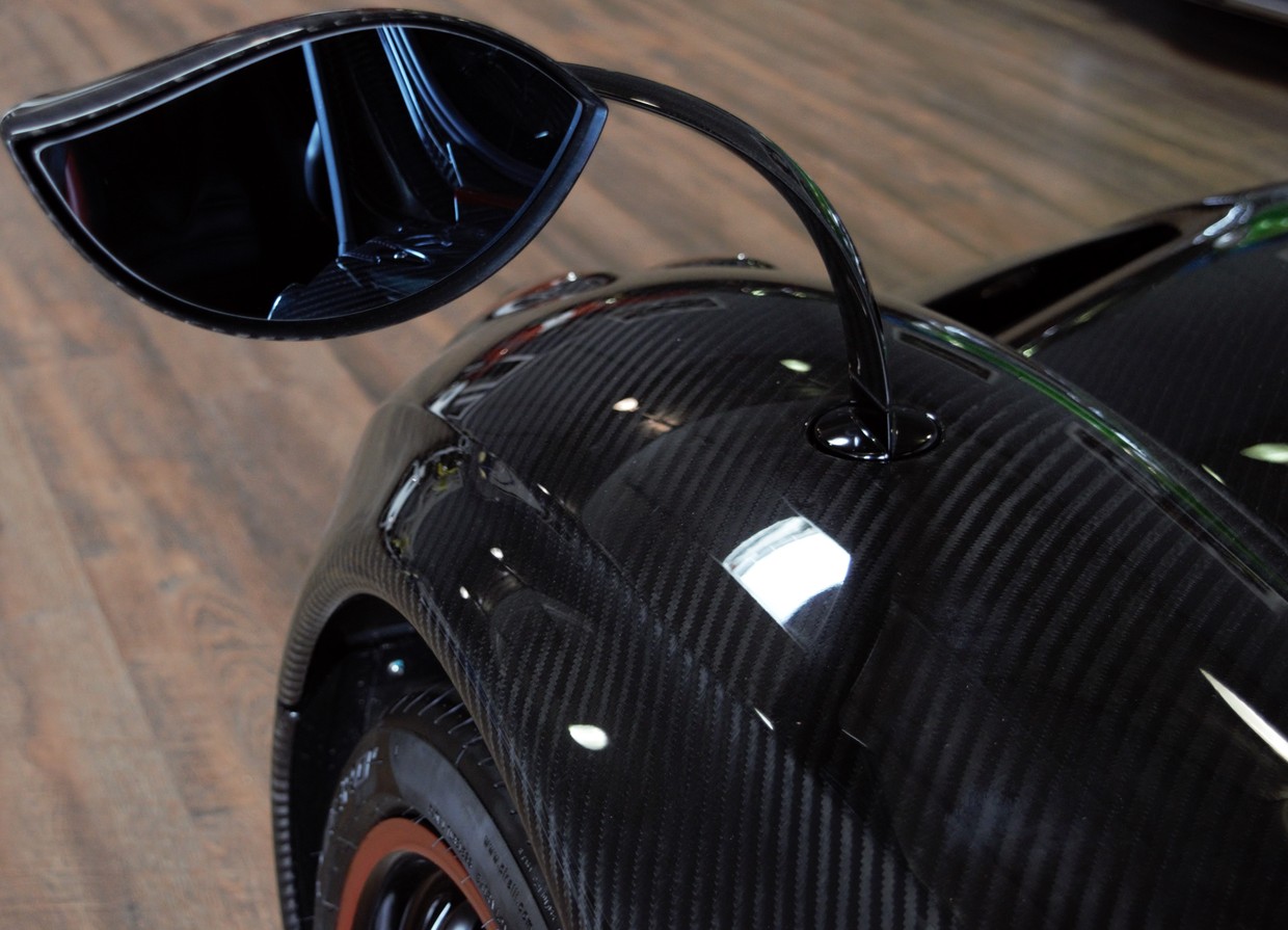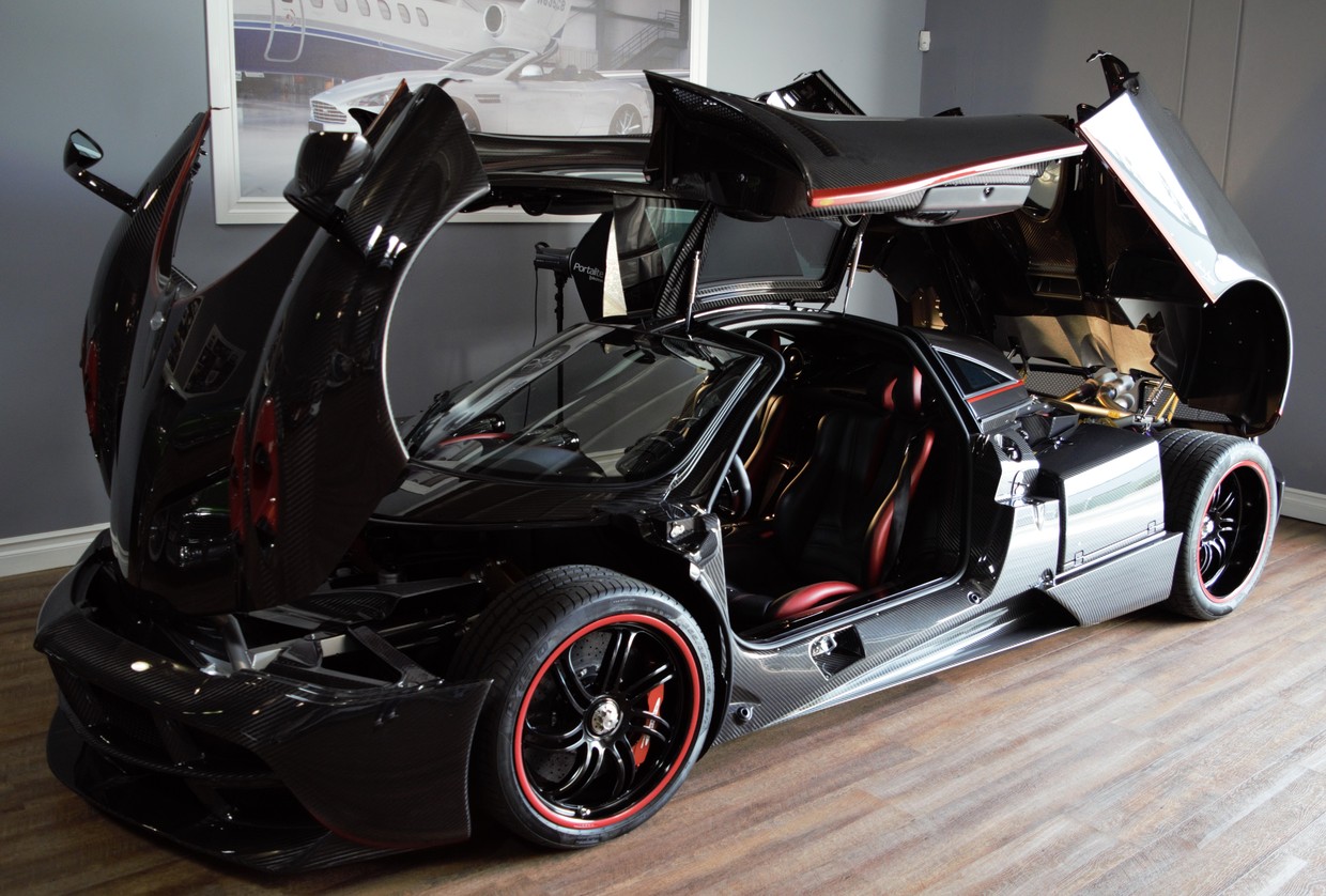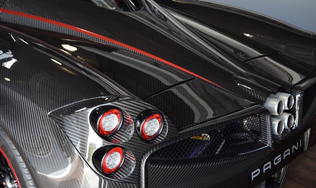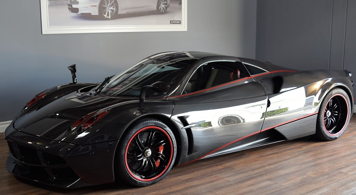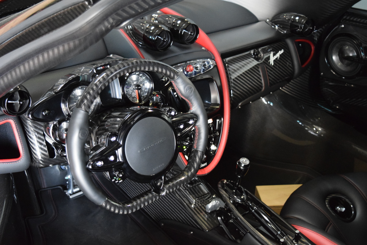Listed on the Californian market, the entire exterior includes an exposed carbon fiber finish, an extremely expensive option offered by the marque. The grey carbon has then been offset thanks to red pinstripping across the body, wheels and the headlight surrounds. The cabin is just as special and combines blacked-out aluminum like the Huayra BC alongside carbon and the finest red and black leather.