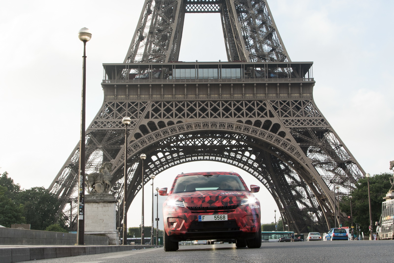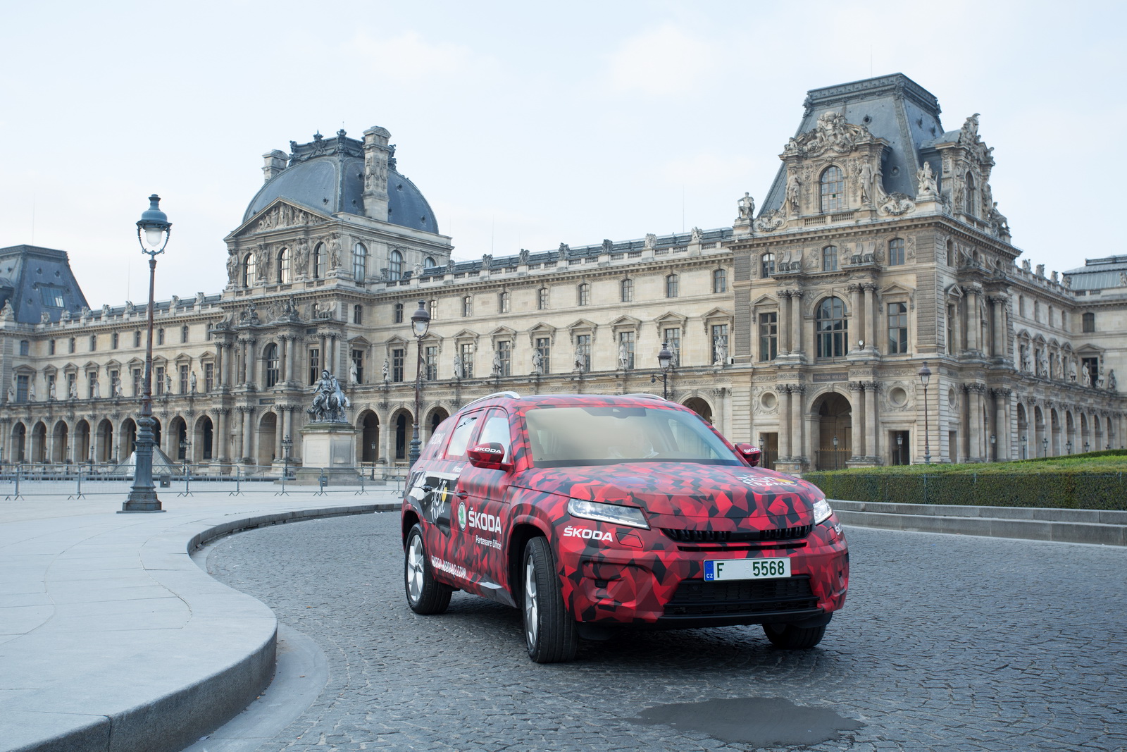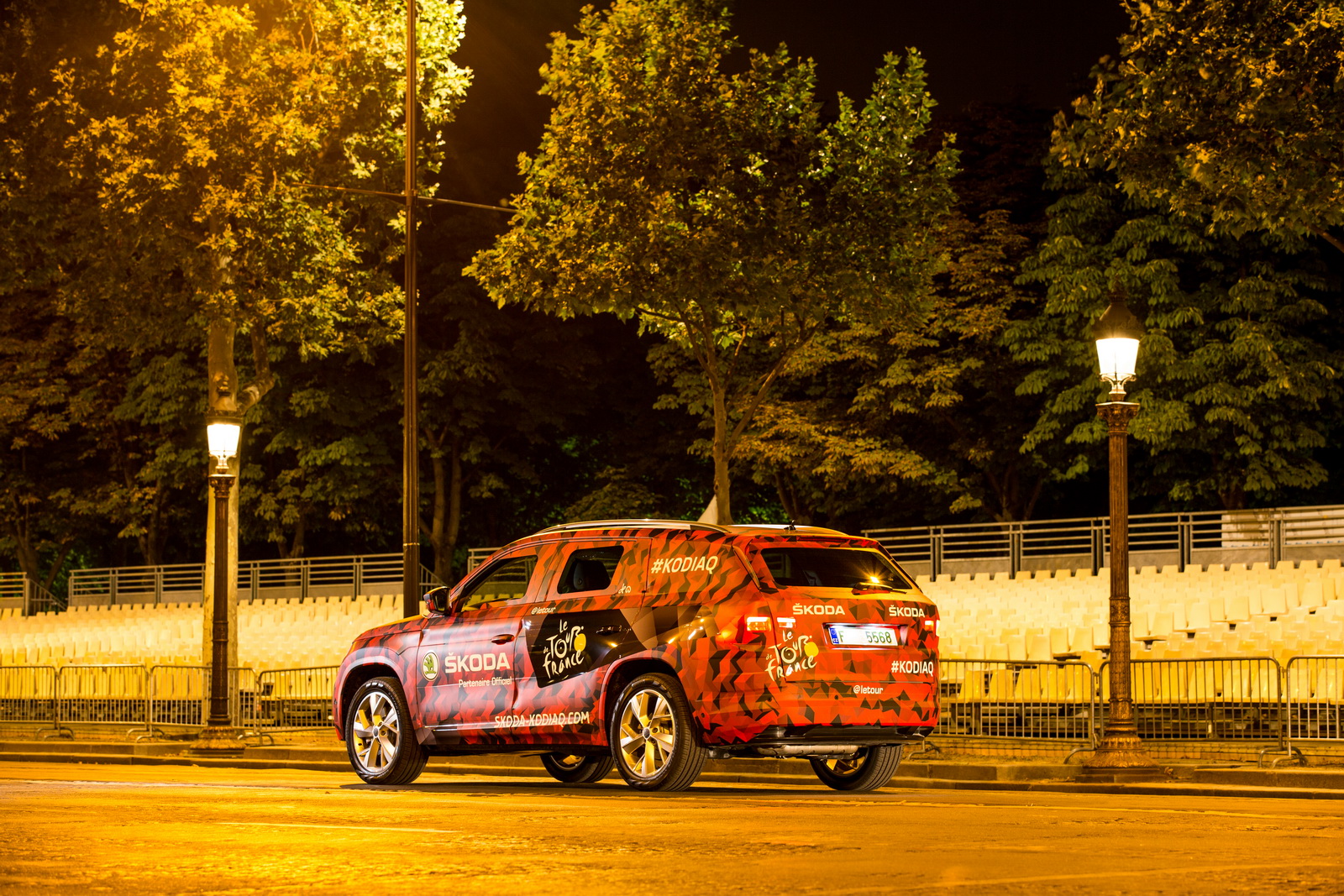 Sporting its new red, grey and black camouflage foil, with facets made of crystal-like elements to mimic the looks of the Red Car Skoda Superb, finished in Corrida Red that served as a mobile control center at the competition, the Kodiak has been getting itself familiar with the event’s home straight, with some nighttime driving on Champs-Elysees.