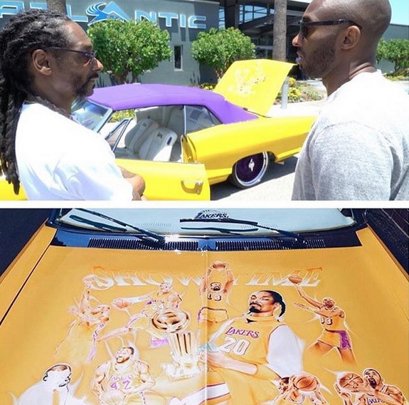 If you look closely at the hood, you’ll notice this sort of alternate universe Lakers team where Snoop plays ball alongside former Laker greats such as Magic, Kareem, Wilt and of course Kobe (#24) is there as well.