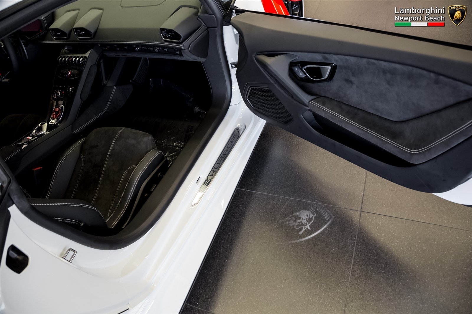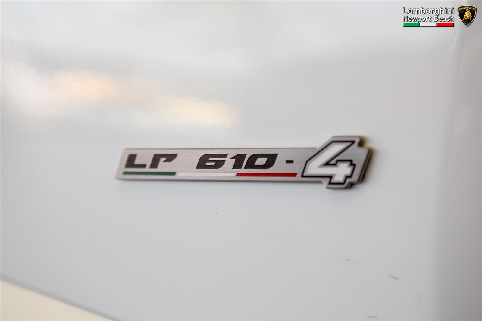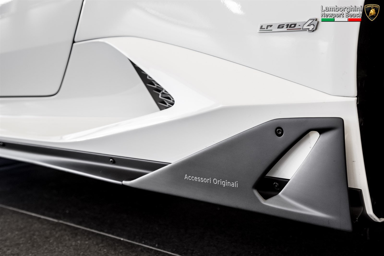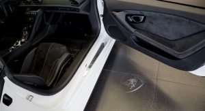 According to the description, the 601 HP (610 PS), 5.2-lire V10-powered, all-wheel-drive supercar features many new OEM Lamborghini accessories, made available via Lamborghini’s Accessori Originali catalog. It comes with the Track Telemetry Package, full Exterior Aero-Body Kit, Lamborghini Script and Shield Puddle Lights, and Aesthetics Graphics Kit in Red, contrasting the stylishly Bianco Monocerus exterior hue.