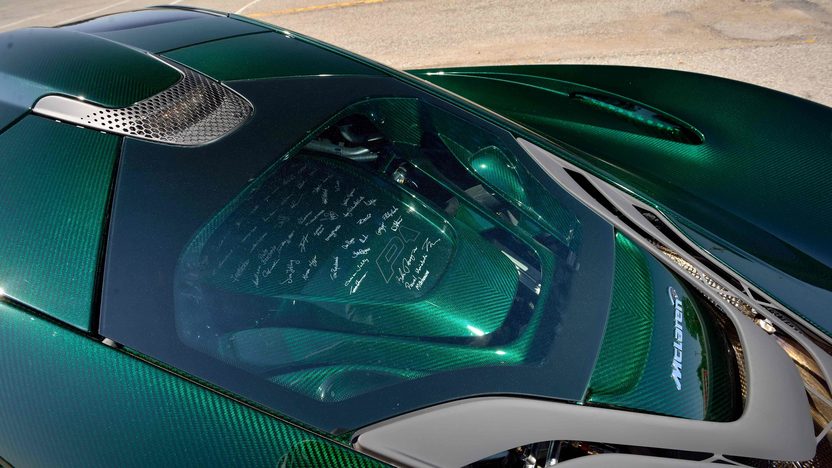 The obvious headliner of the car is its exposed green-tinted carbon fiber body. The model originally rolled off the production line in early 2014 with a painted carbon fiber body, just like all other P1s. In 2015, McLaren announced that it would offer a handful of P1s with exposed carbon bodies, offering owners the choice to have their cars shipped back to the factory and overhauled with all new panels.