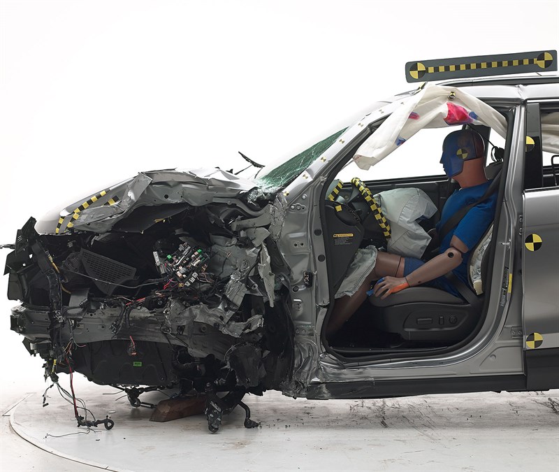 The Institute’s engineers have noted 4 inches (10.2 cm) maximum intrusion at the lower door hinge pillar, while the safety belt and airbags worked to control the dummy’s movement, earning it a Good rating in the challenging small overlap test.