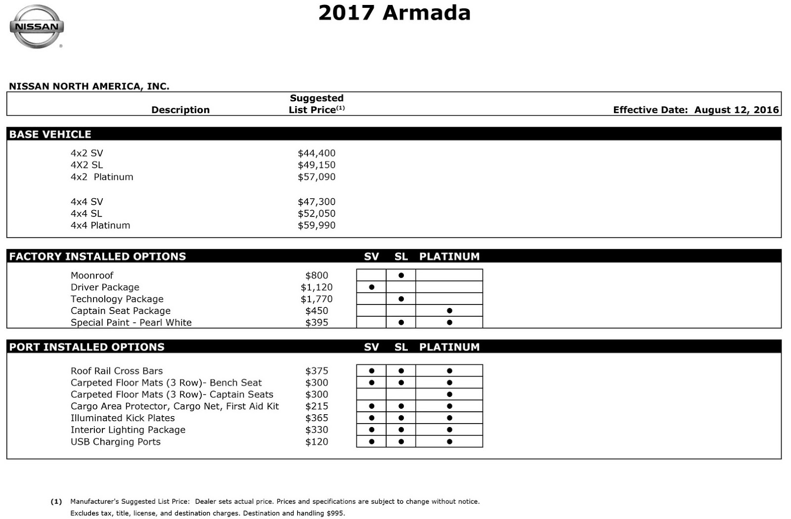 As previously stated when I drove the 2017 Armada last month, the base SV model will start at $45,395, including the $995 destination charge. Leather-lined SL versions start from $50,145. And the top Platinum model, with lots of chrome and a rear entertainment system, goes from $58,085.