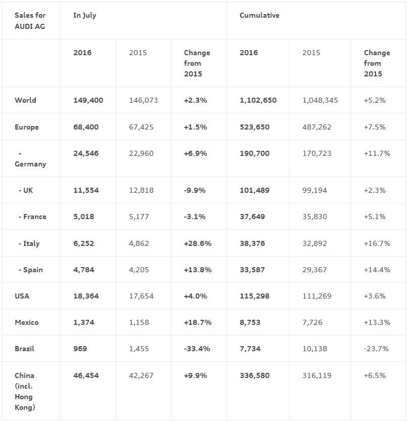 Despite the challenging conditions, Audi AG’s global operations have increased year-to-date by 5.2 percent worldwide, to 1,102,650 units, led by Europe, China and the USA, in this order; last month alone, it delivered 149,400 units, up 2.3 percent over July 2015.