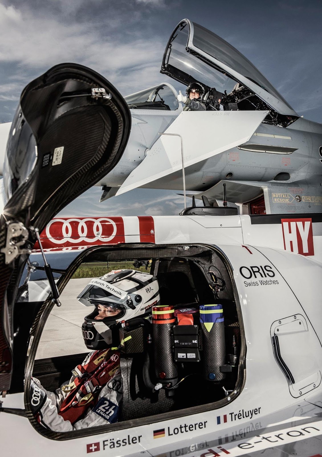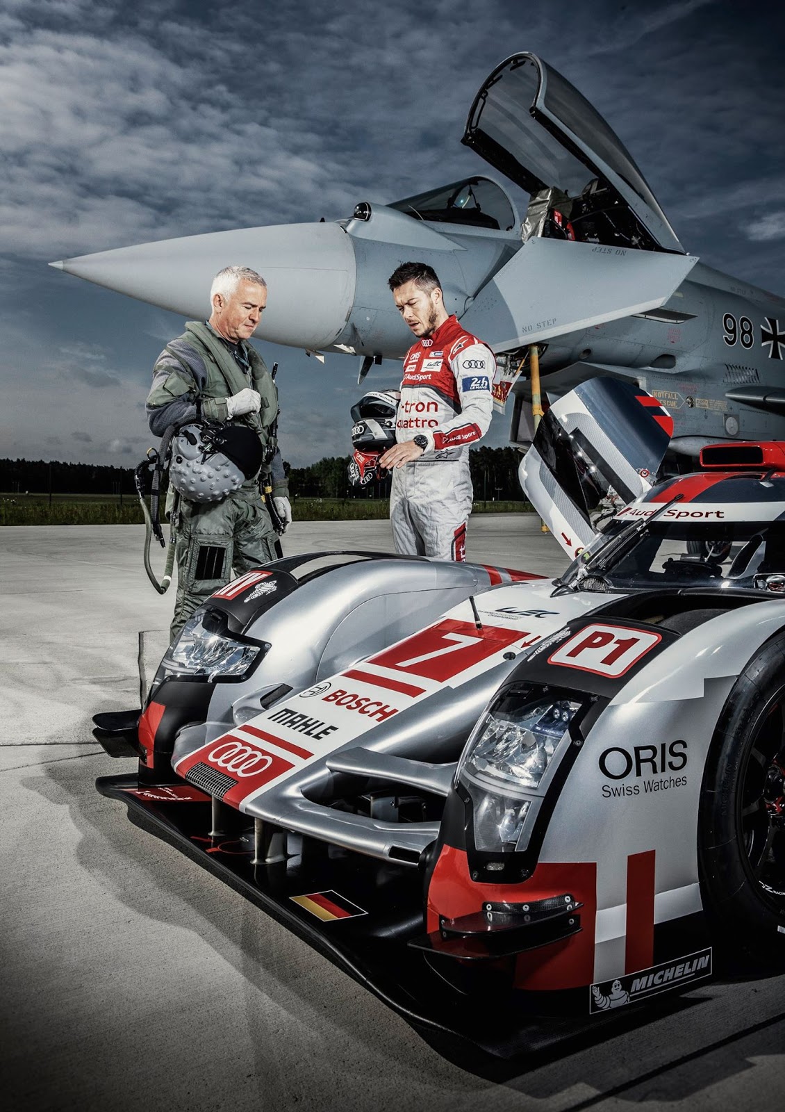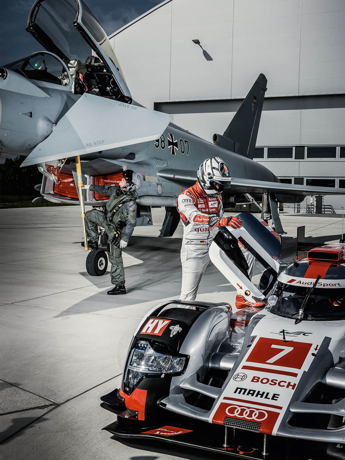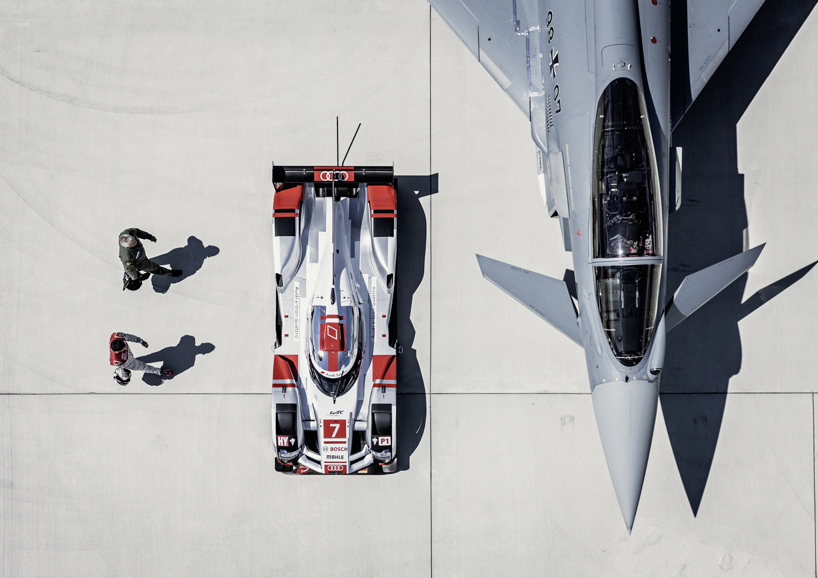 For the latest issue of its Encounter technology magazine, Audi brought its victorious hybrid Le Mans prototype together with Europe’s cutting-edge multirole fighter jet, manufactured by the Eurofighter GmbH consortium based in Hallgermoos, Bavaria at the edge of the Munich International Airport – just an hour’s drive down the A9 autobahn from Ingolstadt where Audi is based.