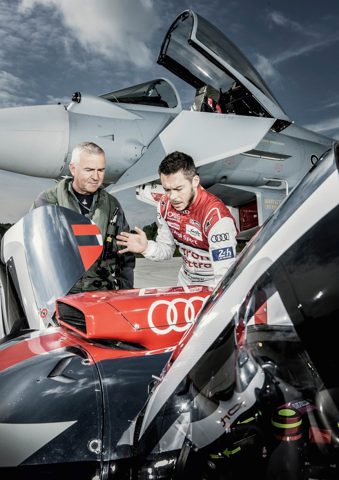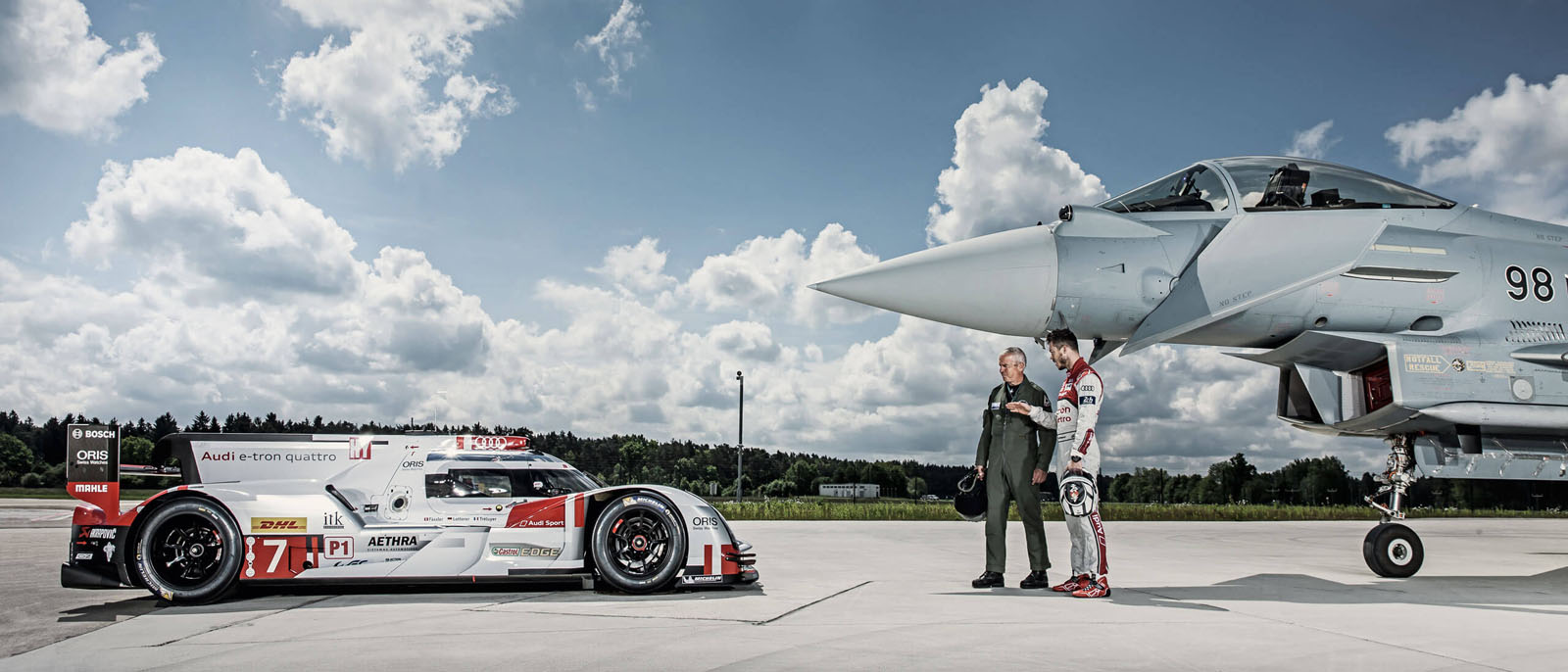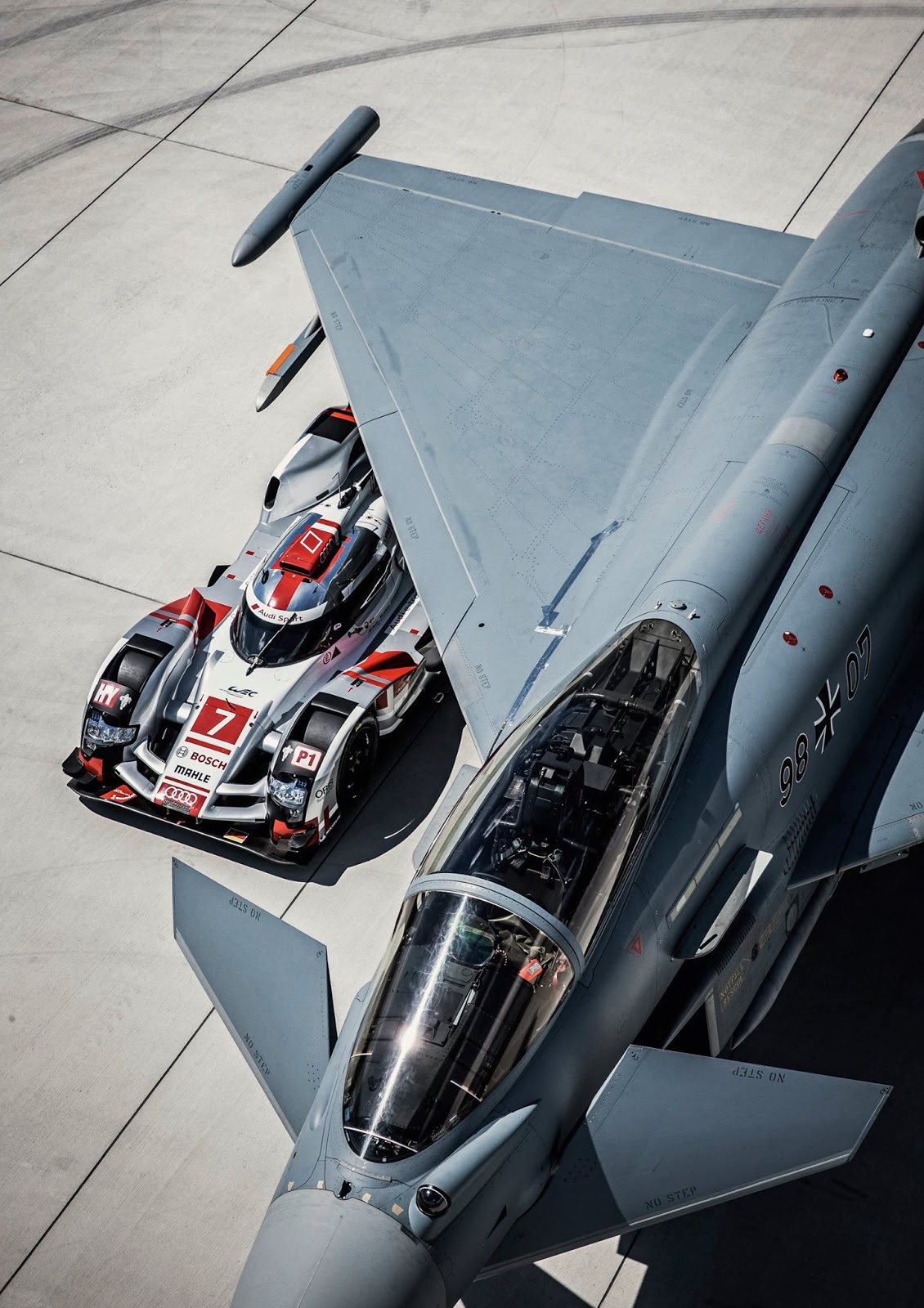 Cockpit. Pilot. Throttle. G-forces. Aero. Wings. There’s a reason why racing cars and fighter jets share so much in common. They’re both built for extreme performance – to be able to go as fast and turn as tight as possible, outmaneuvering the competition and winning the fight for which they’re built. Like the Audi R18 E-Tron Quattro and the Eurofighter Typhoon.