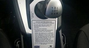 The instruction tag states the ‘Proper Shifting Operation’ and tips on how to avoid transmission damage. These include simple things like fully depressing the clutch pedal before changing gears, only shifting into reverse when the car is stationary, and only changing into reverse after waiting two seconds with the clutch depressed to allow the gears to stop spinning.