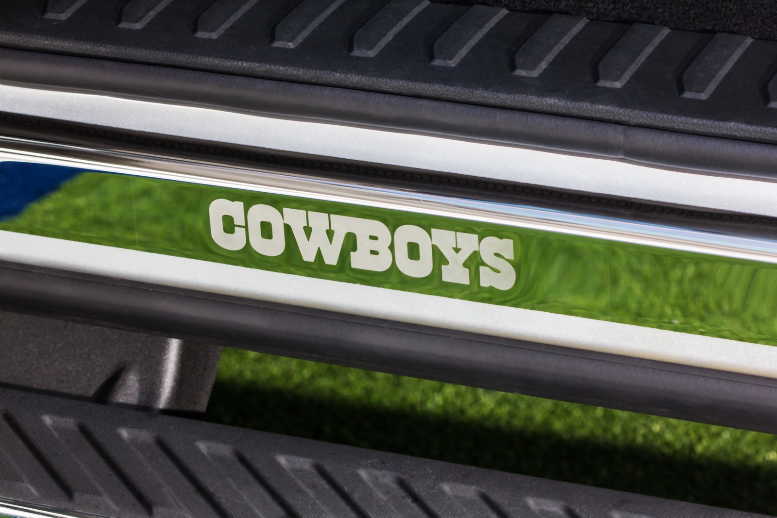 It comes with Cowboys star badging on the front doors and tailgate, blue-white-blue rocker panel striping, 20″ chrome wheels with unique Cowboys star center caps, molded heavy-duty cargo bed mat with Cowboys star logo, laser-etched chrome foot plates with Cowboys word mark, Cowboys edition logo stitched into the front & rear floor mats, and finally a “1 of 400” Cowboys edition interior badge autographed by Jerry Jones – the owner of the football club.