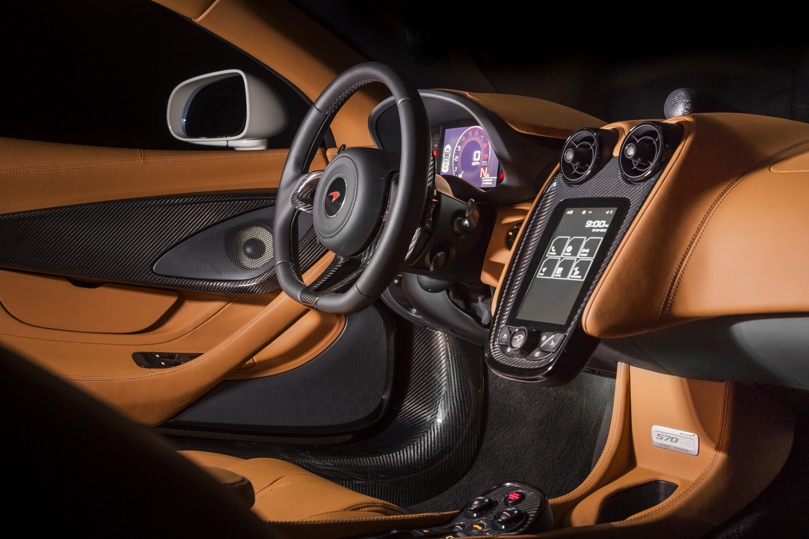 Around back is a titanium exhaust derived from the system on the 675LT, heat-shielded in gold-tinted titanium nitride in a nod to the original McLaren F1. The glass roof has been upgraded with an electro-chromatic panel that can change its tint at the touch of a finger – a much-needed feature, we found from driving the 570GT recently, where the cockpit can get rather hot under the bright sun.