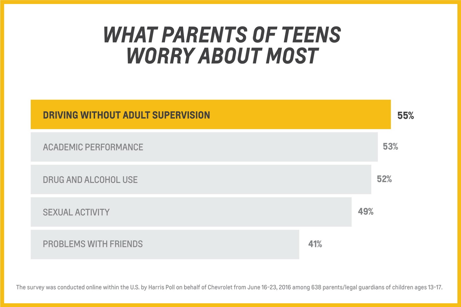 According to a survey commissioned by Chevrolet, more parents with teens worry about their child driving than they do about academic performance, drugs and alcohol use or any other issues that generally tends to stress them out.