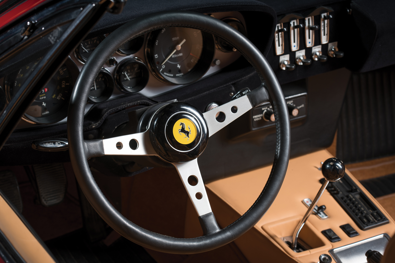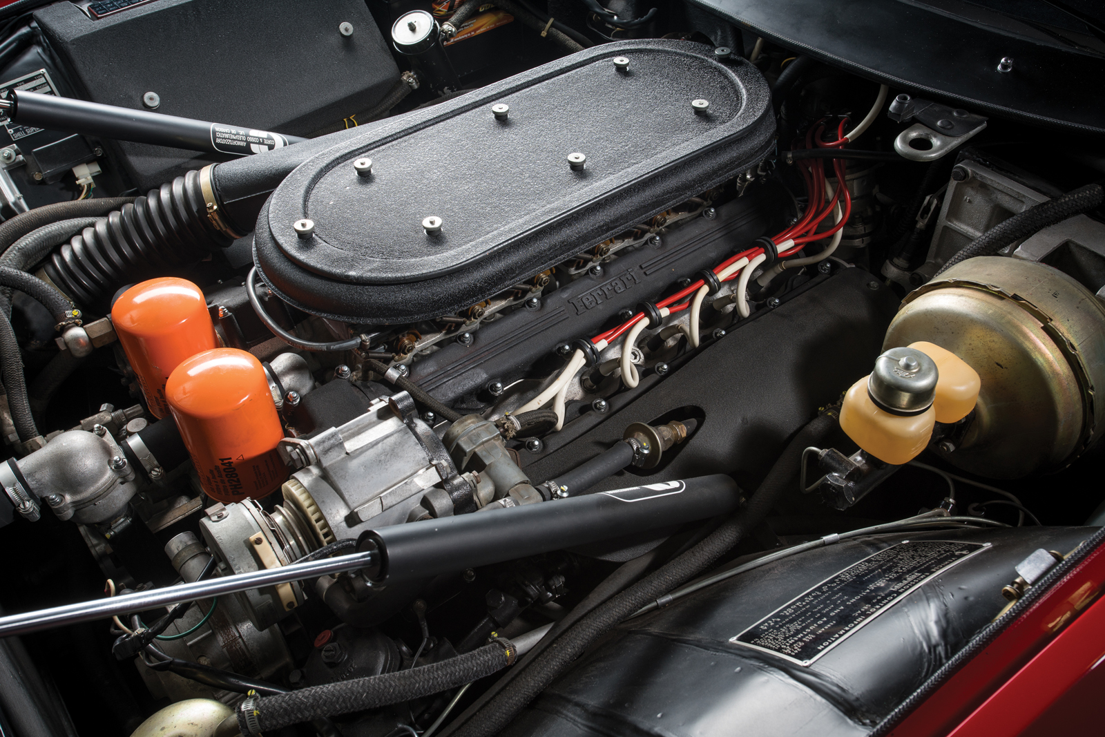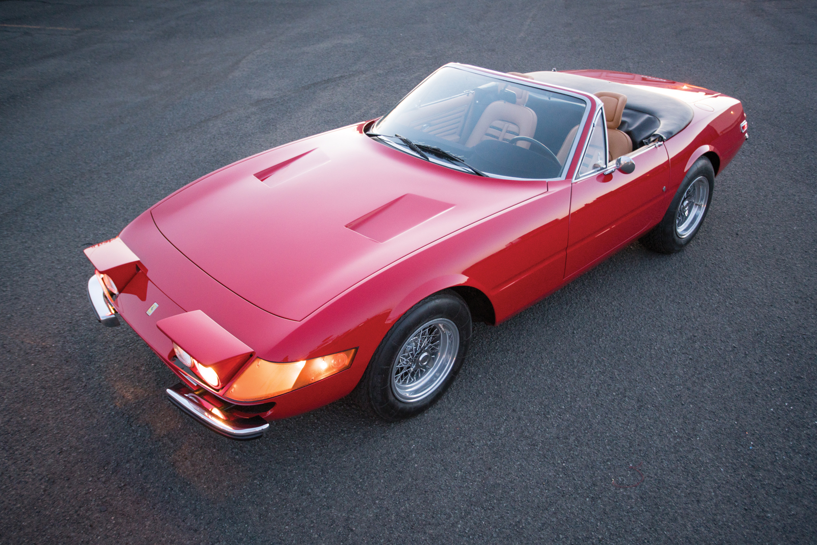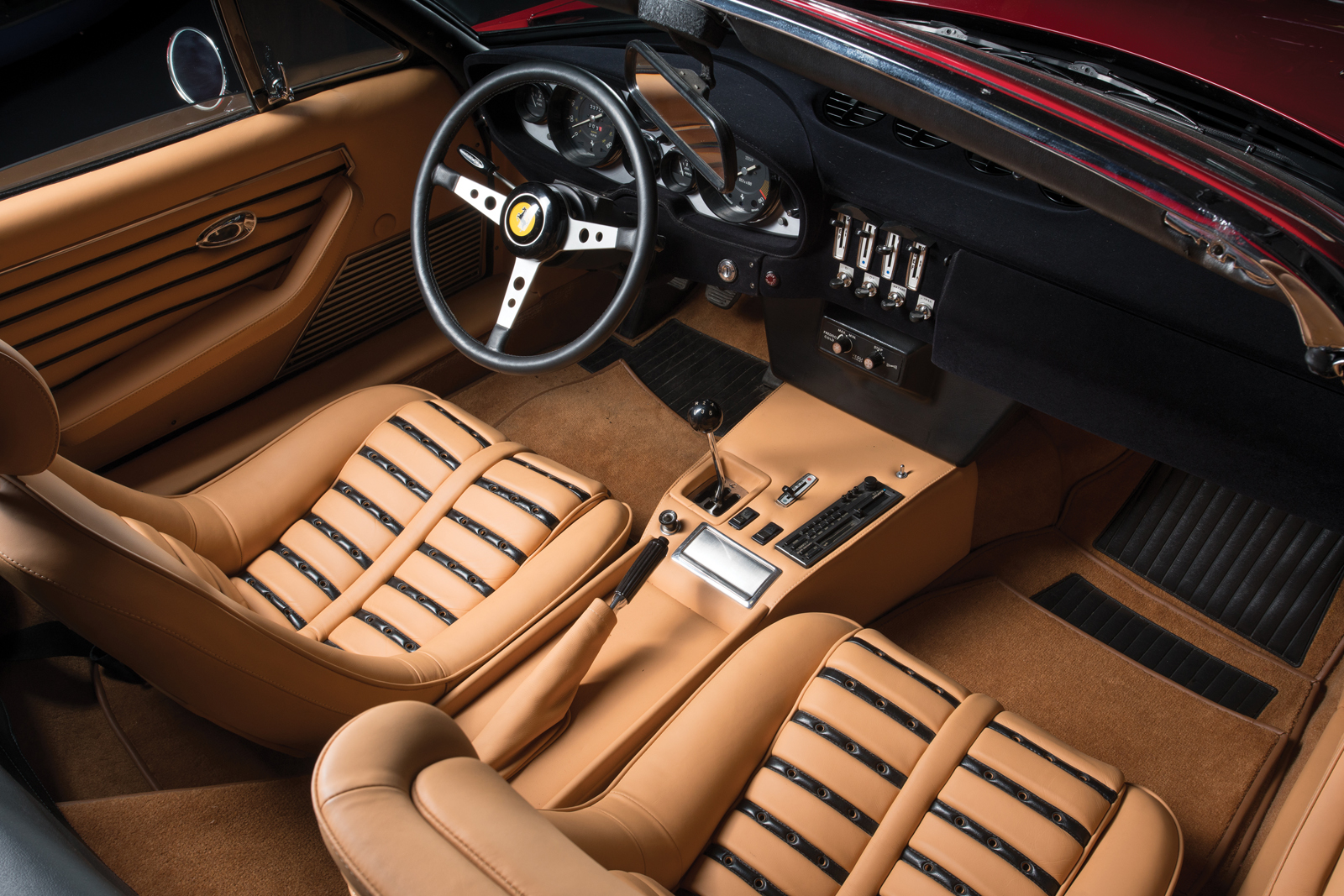 This particular example, chassis number 16847, was delivered new to the United States in silver over black and equipped with factory air conditioning. It traded hands across America numerous times until its owner in Pittsburgh had it redone in Rosso Corsa with a tan leather interior.