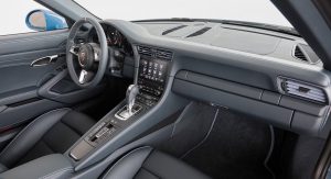 Black anodized stainless steel door entry guards, graphite-blue leather, adaptive sports seats plus with 18-way adjustment, Porsche logo embossed into the headrests, 911 Targa silhouette adorning the cover of the storage compartment in the center console and “Porsche Exclusive Manufaktur” on the trim of the dashboard, along with decorative stitching, will greet those who will step inside.