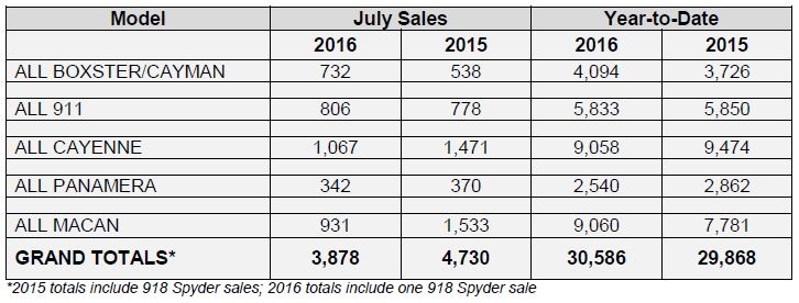 The company’s best-selling model remains the Cayenne full-sized SUV, with 1,067 units finding new homes, down from last July’s 1,471, followed closely by the smaller Macan, whose sales plunged from 1,533 to 931 examples. The 911 and Boxster/Cayman were selected by 778 and 538 clients, respectively, while the Panamera accounted for 370 units.