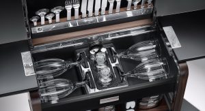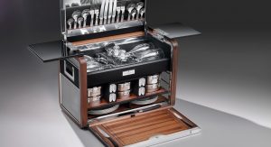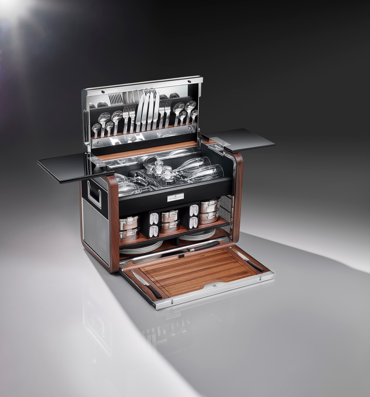 Furthermore, Piano Black picnic tables housed within the hamper fold out on engraved-aluminium hinges (like the armrest cappings inside the car), while the leather and wood interior shelving of the hamper contains lead crystal wine glasses, handmade stainless steel cutlery, napkins embroidered with the Rolls-Royce monogram in Arctic White, a handcrafted American Walnut chopping board, and unique crockery, with painted black and platinum detail around the edges.