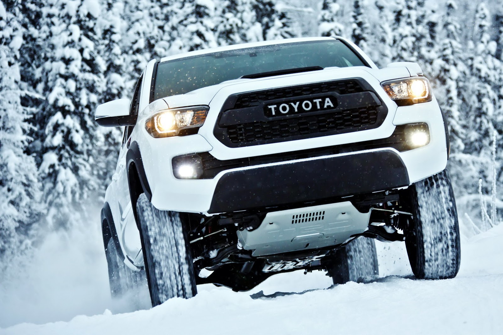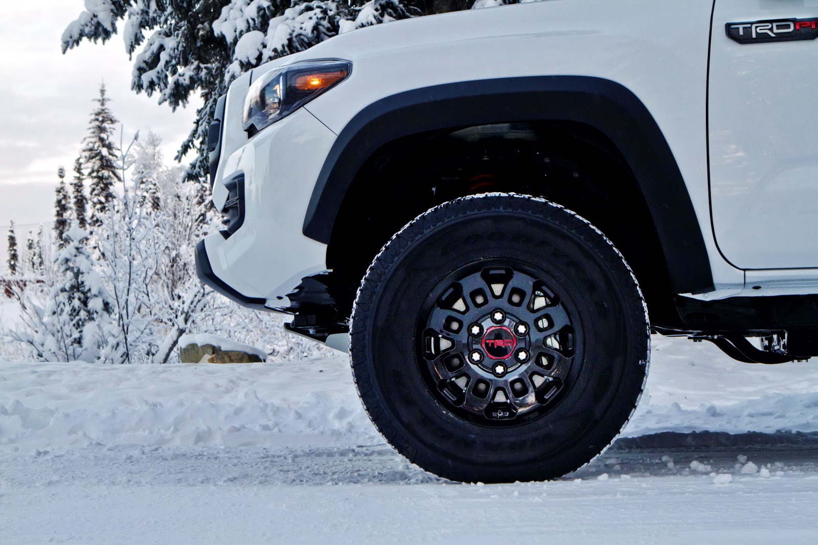 On the outside, the new Tacoma TRD Pro can be distinguished by the heritage-inspired front grille, the blacked-out hood scoop, new projector-beam headlights and taillights with black bezels, a set of 16-inch TRD black alloy wheels shod with Kevlar-reinforced tires, an aluminum front skid plate, black overfenders and many more.