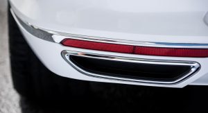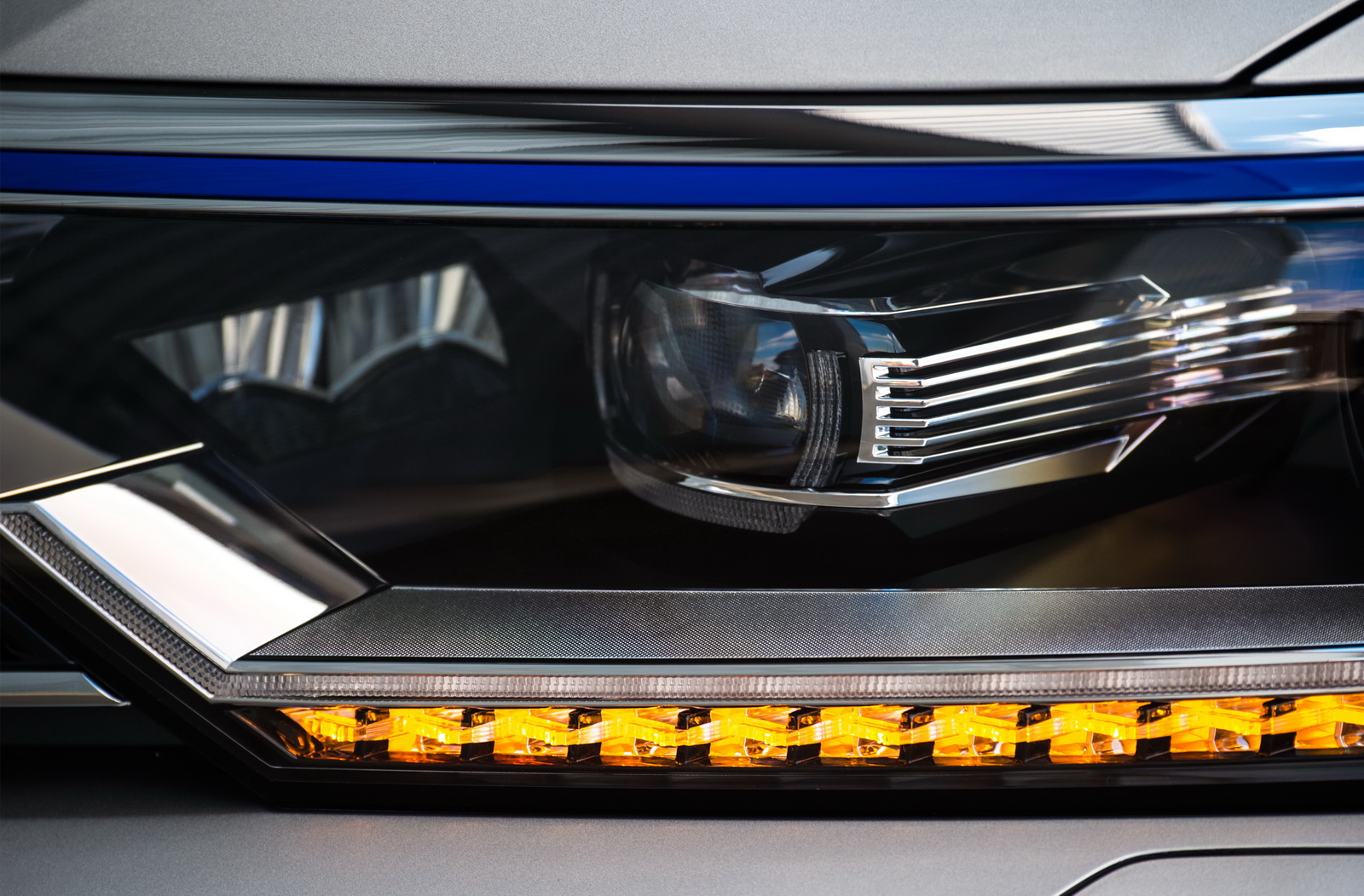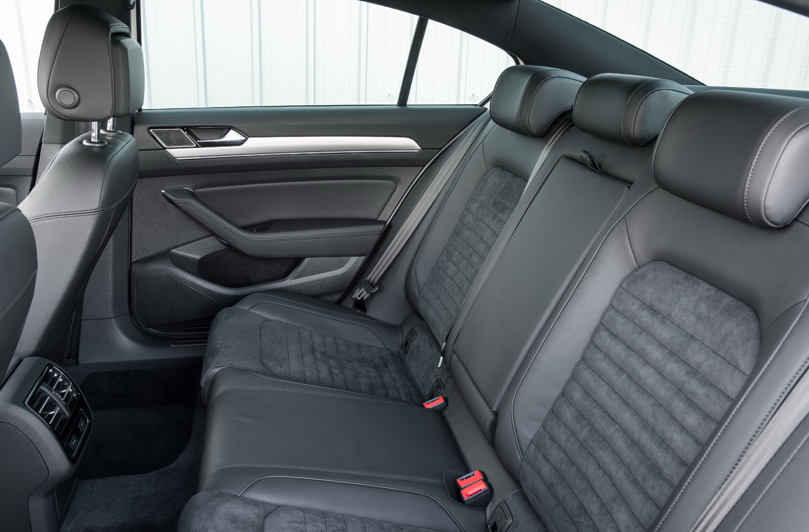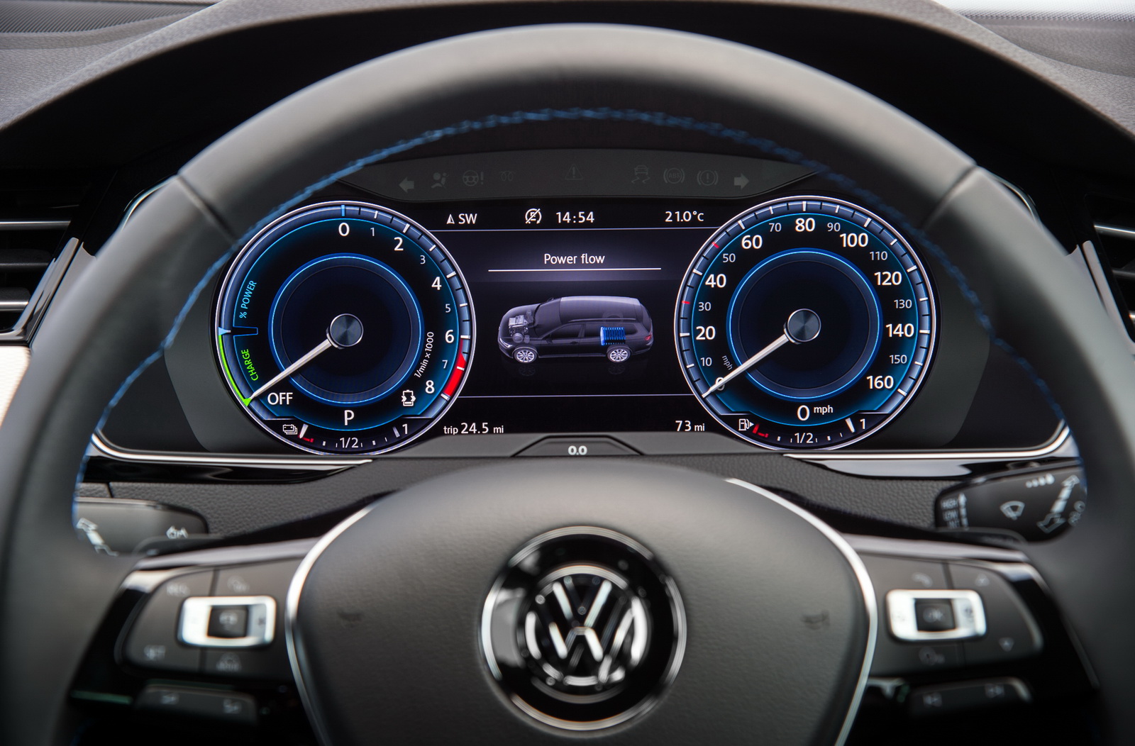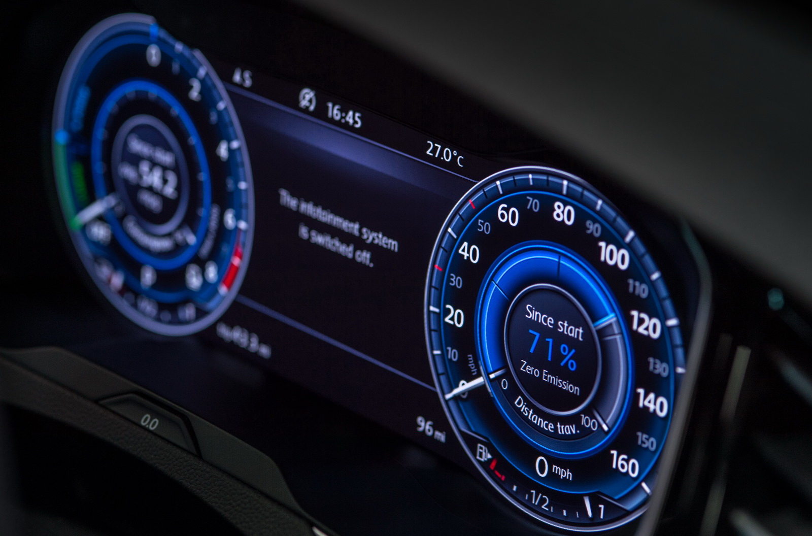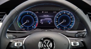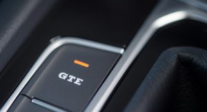 The exterior of the Passat GTE features exclusive C-shaped LED daytime running lights and an additional blue line that runs across the radiator grille, similar traits we’ve seen before in the Golf GTE. The front bumper is also redesigned while the standard 18in wheels are also model-specific.
