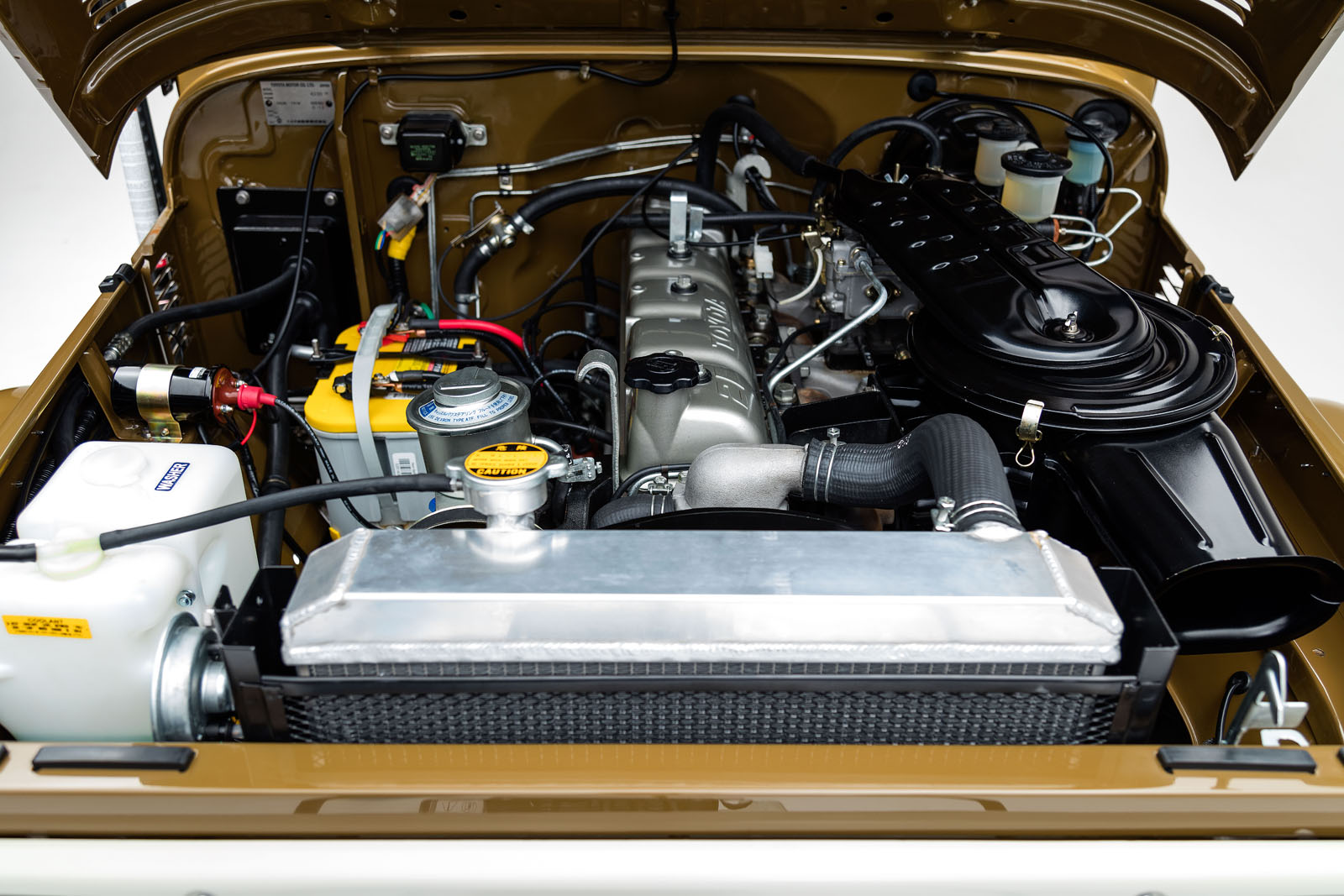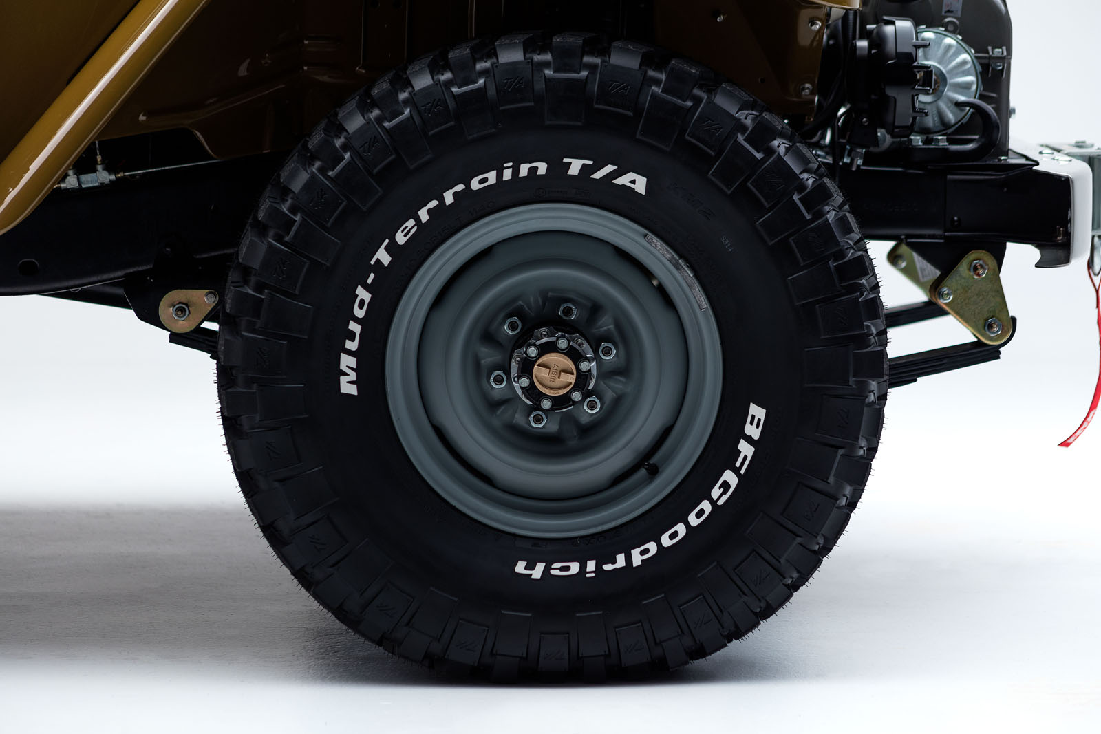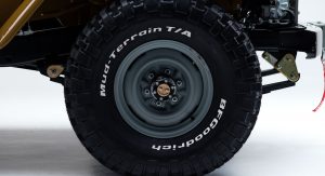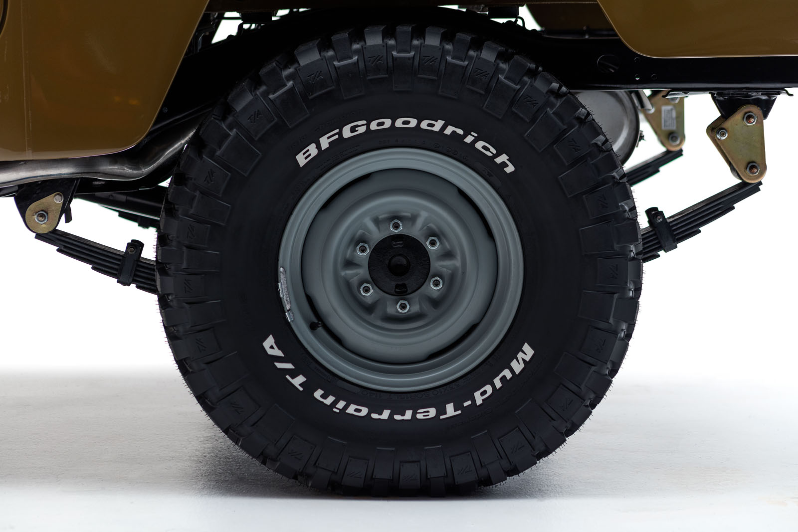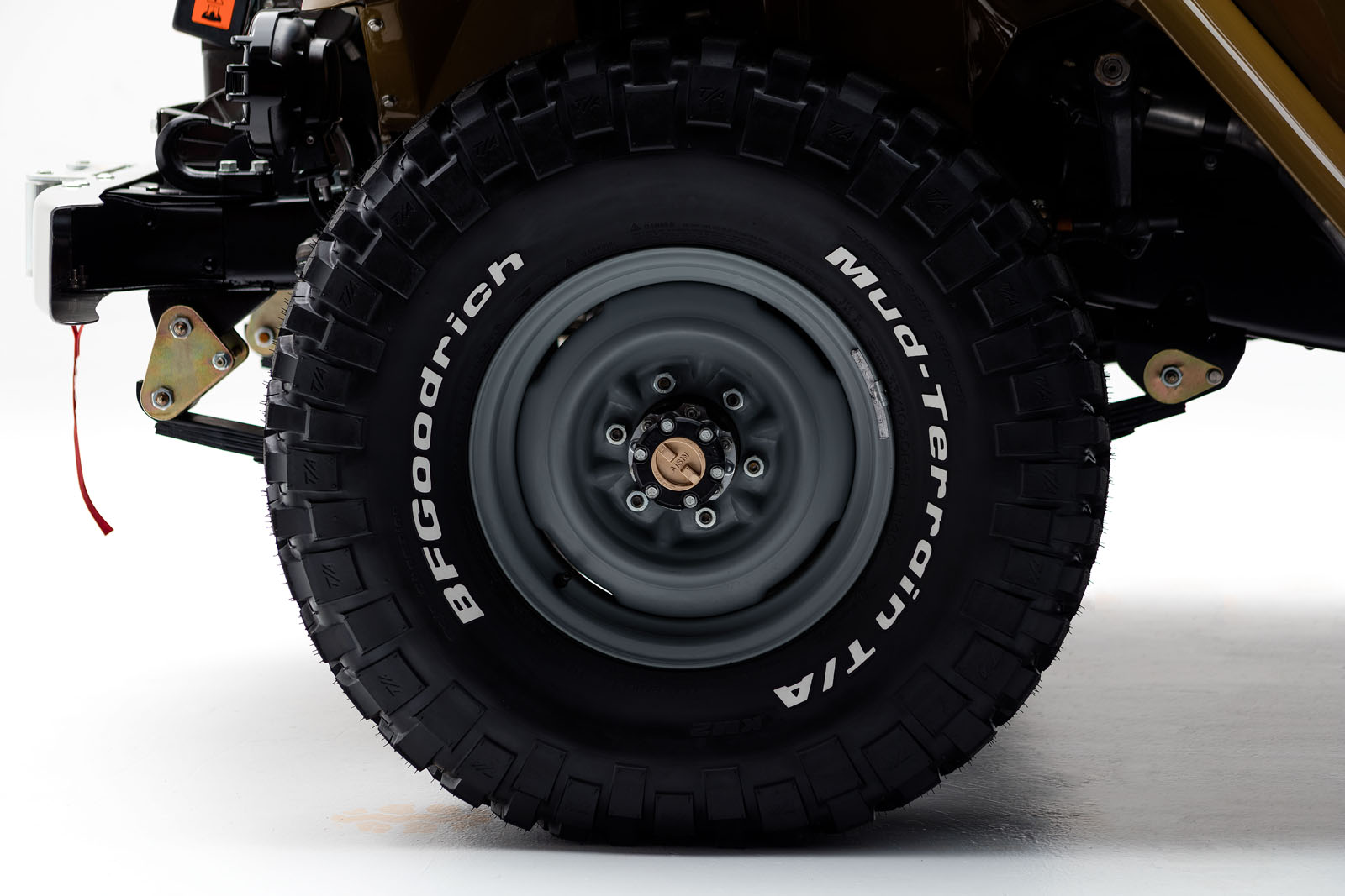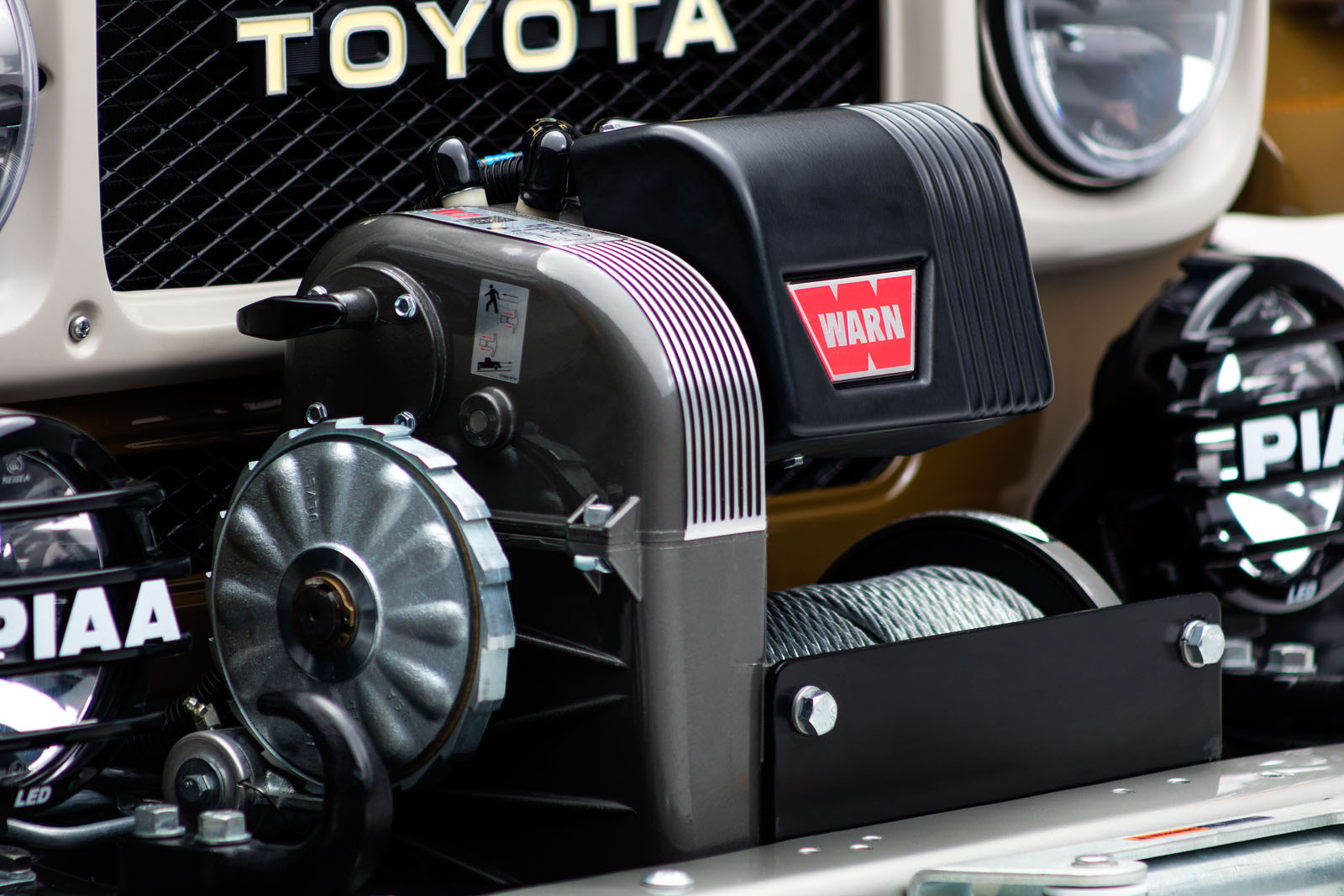 The company completed a full frame-off restoration that saw it rebuild the original engine along with the power steering system and front disc brakes. They installed a new carburetor, suspension, starter motor, pumps, aluminum radiator and five-speed manual transmission, and added a custom roll cage, fire suppression system, LED headlamps, winch… the works.