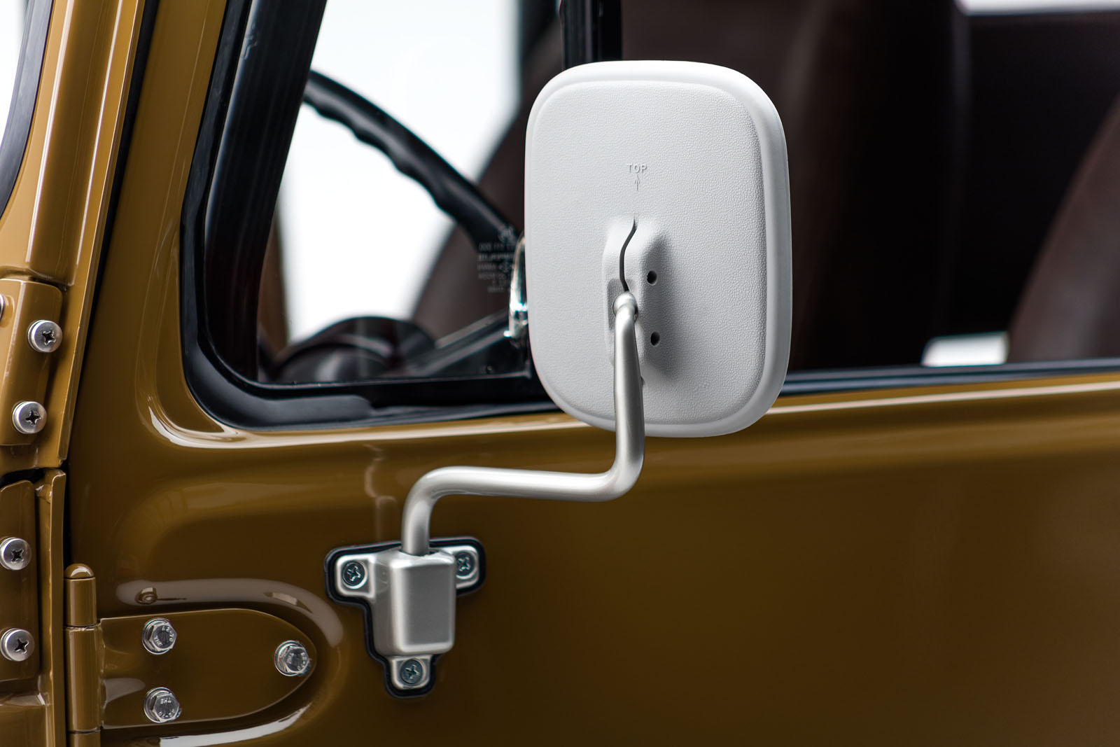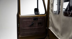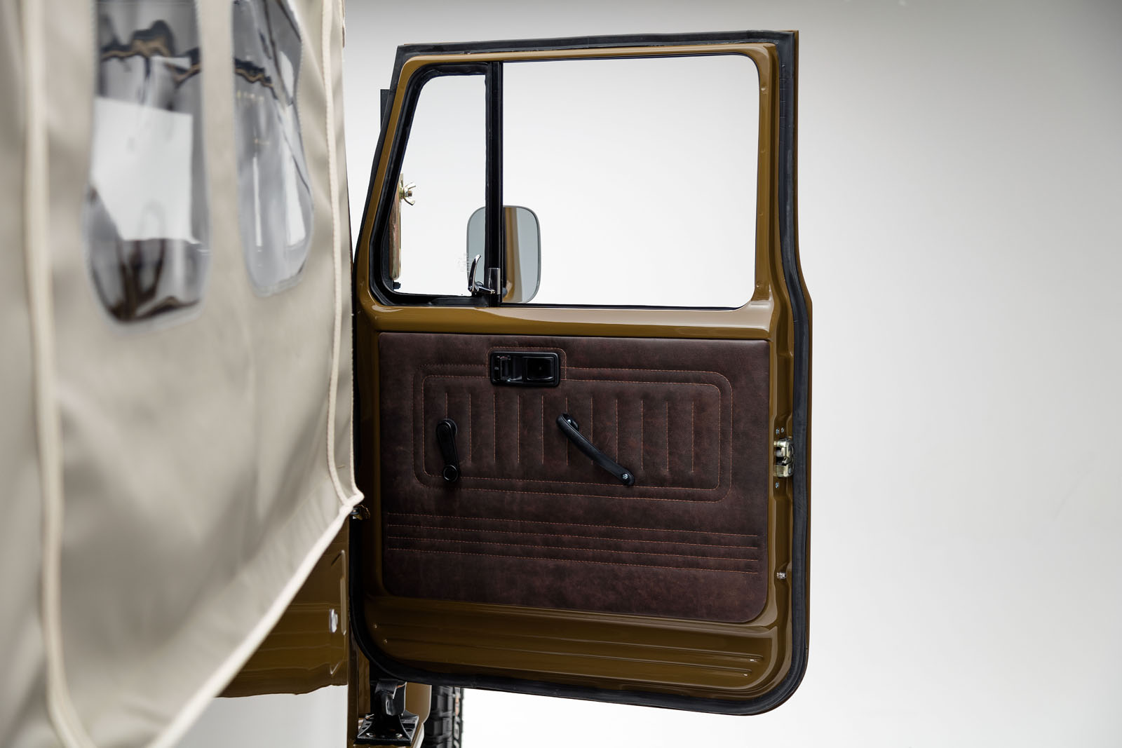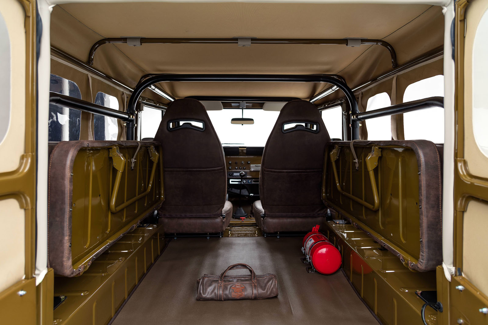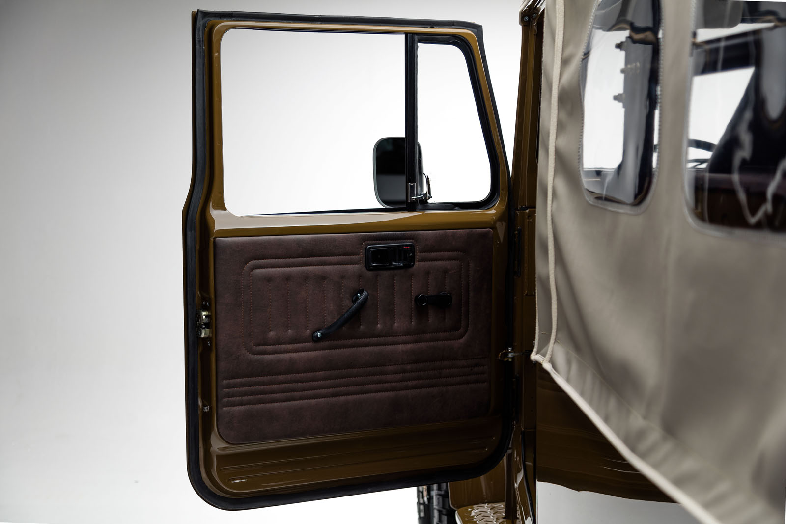 They painted it Olive 637 – right out of the original factory catalog – and upholstered the interior in brown leather, from the door panels and fold-down rear benches to the Corbeau Moab front buckets.