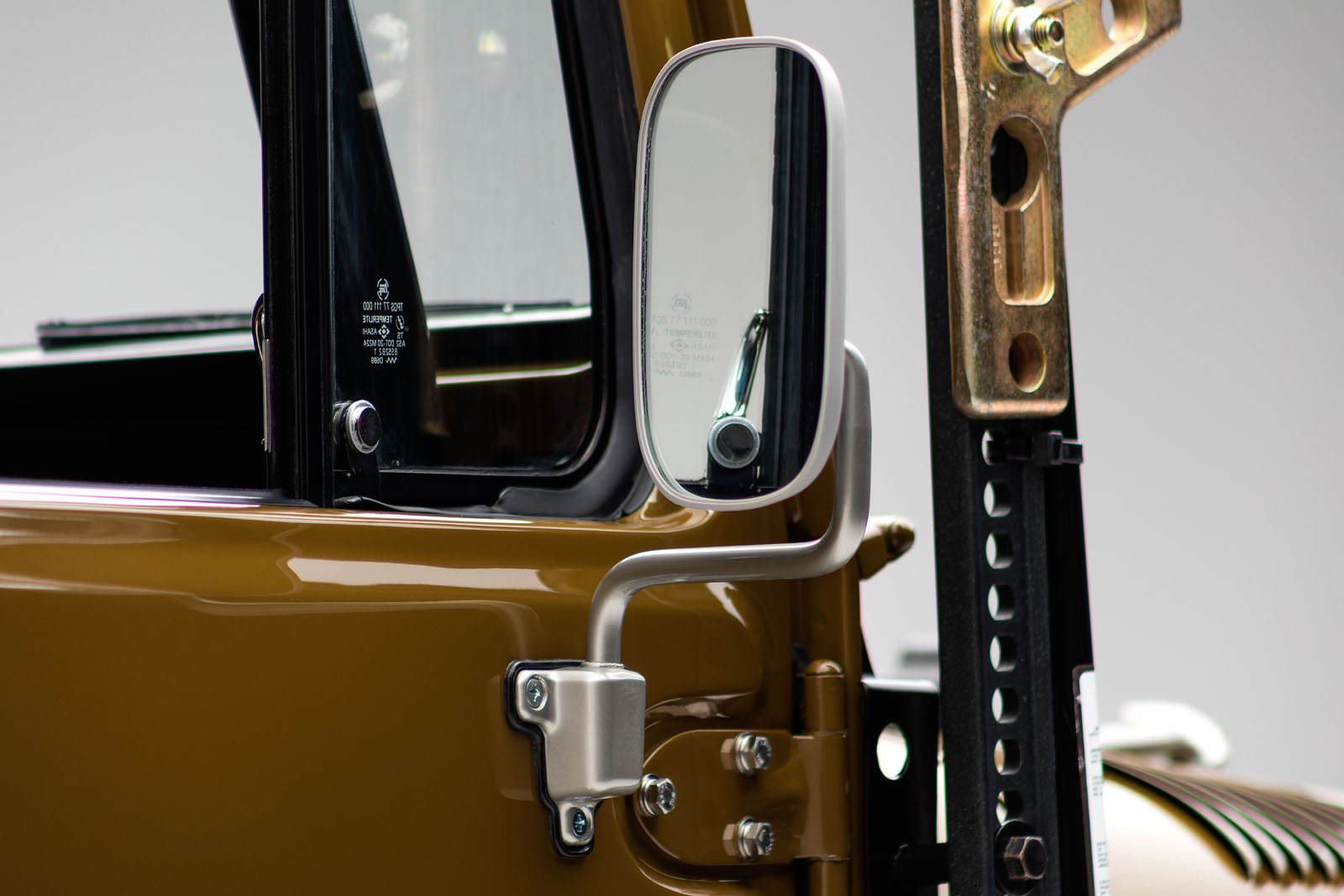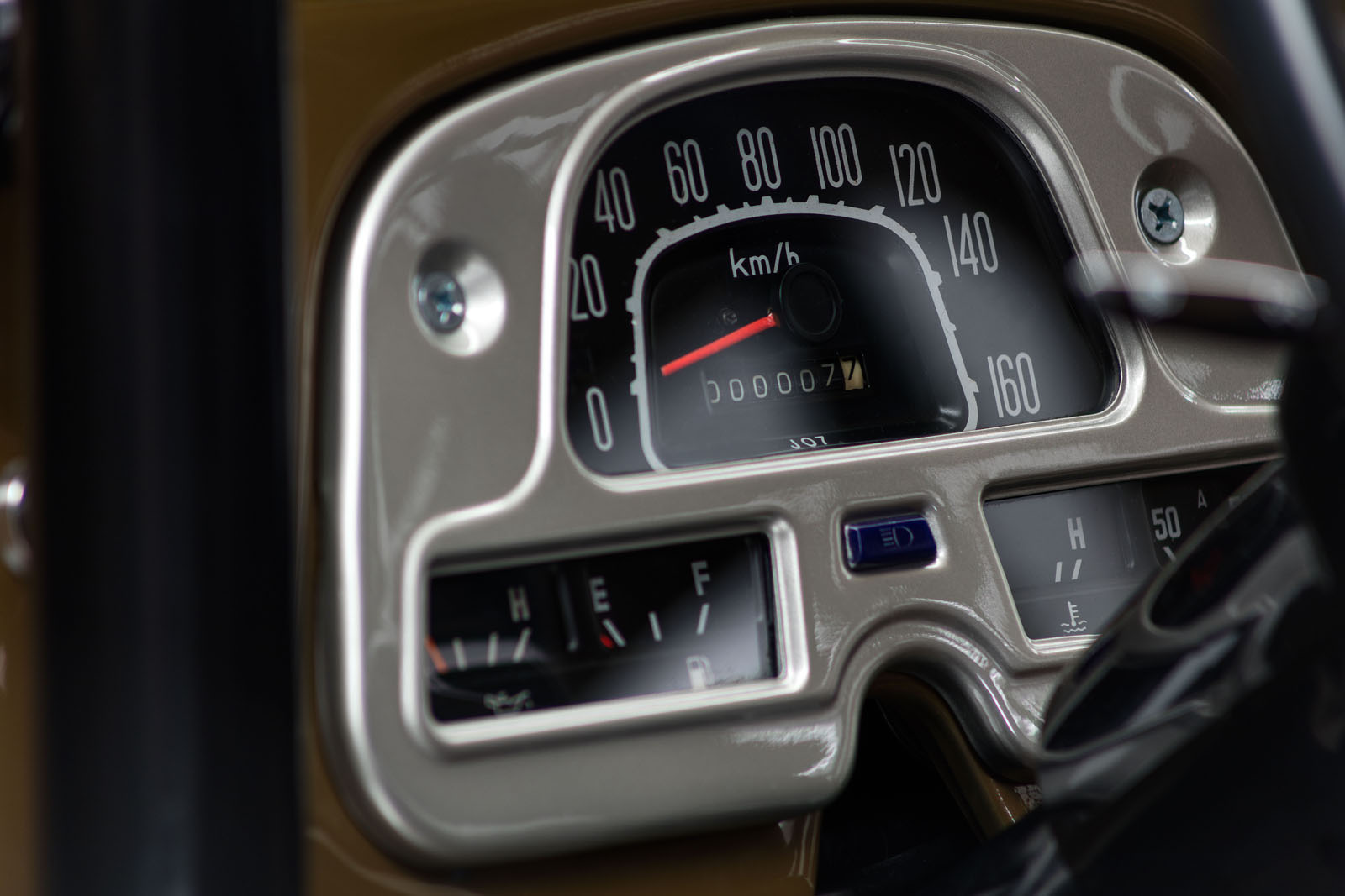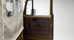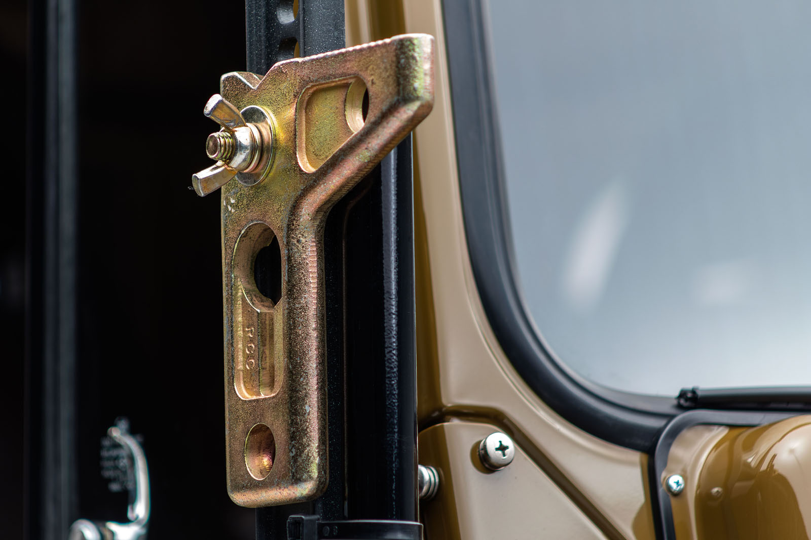 They painted it Olive 637 – right out of the original factory catalog – and upholstered the interior in brown leather, from the door panels and fold-down rear benches to the Corbeau Moab front buckets.