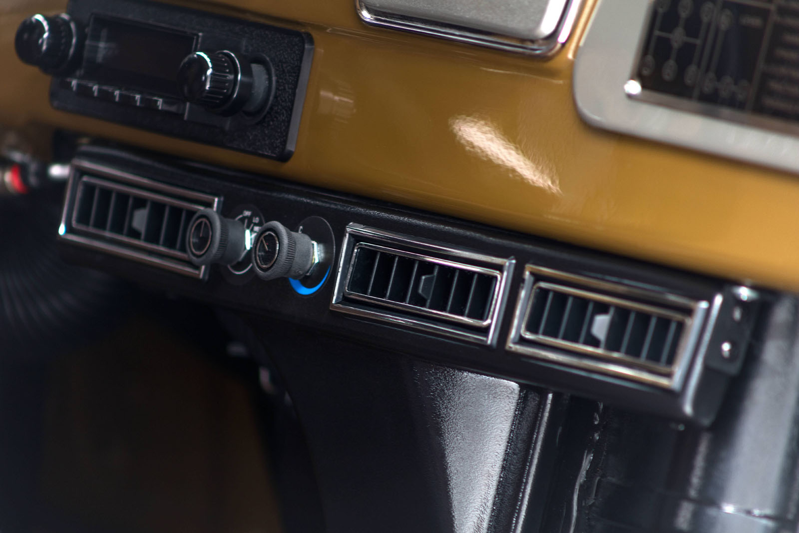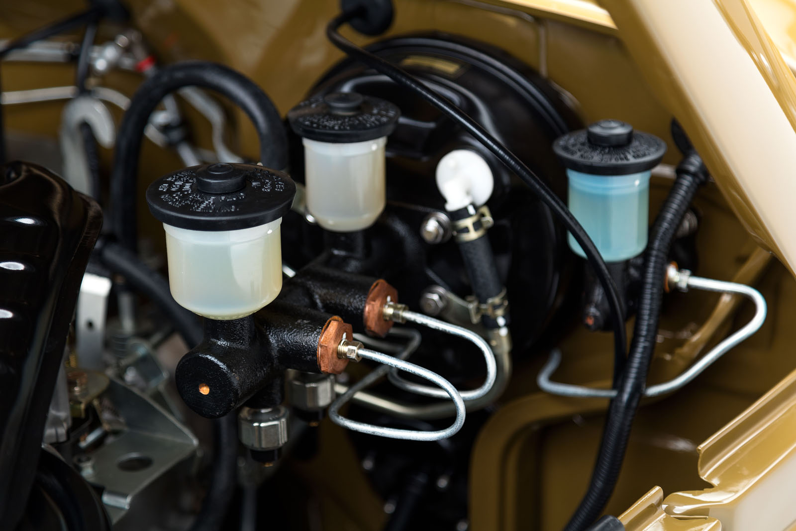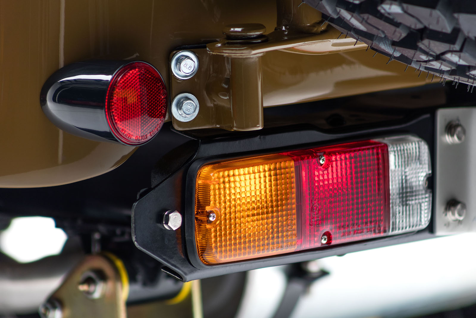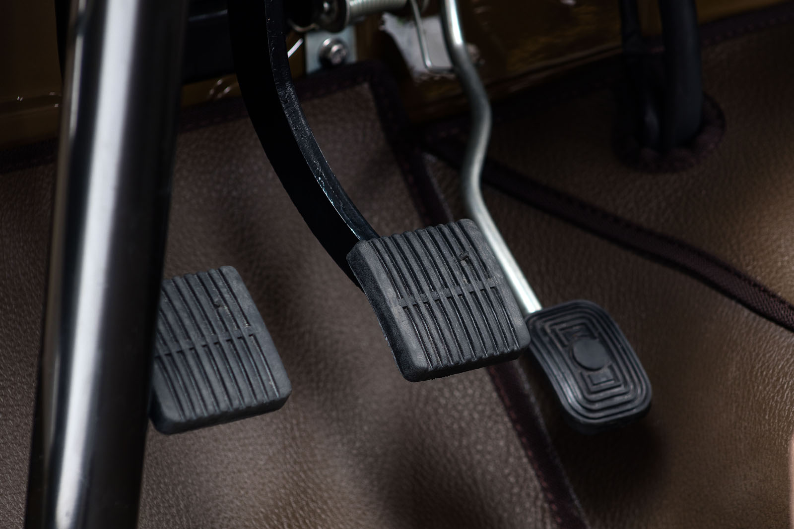 They painted it Olive 637 – right out of the original factory catalog – and upholstered the interior in brown leather, from the door panels and fold-down rear benches to the Corbeau Moab front buckets.