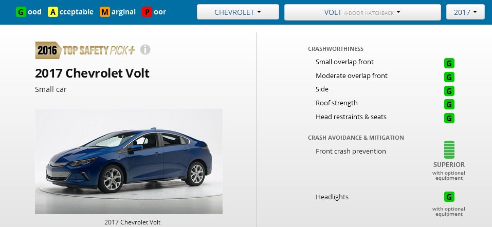 Redesigned for the 2016 MY and arriving with the Insurance Institute for Highway Safety’s (IIHS) engineers as a 2017 MY, the Chevrolet Volt has qualified for a Top Safety Pick+.