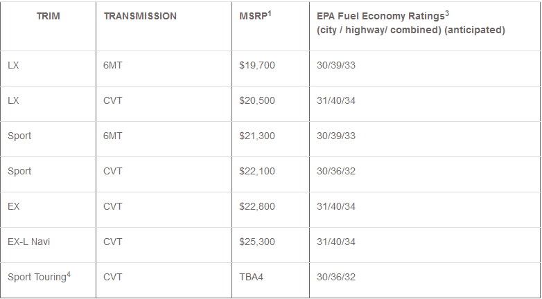 The starting MSRP of $19,700 represents the base-spec LX model which features a 6-speed manual transmission and a 1.5-liter turbocharged in-line 4-cylinder engine with 174 HP and 167 lb-ft (226 Nm) of torque.