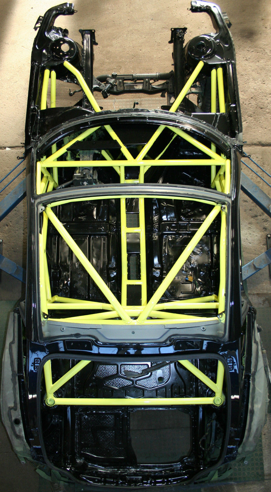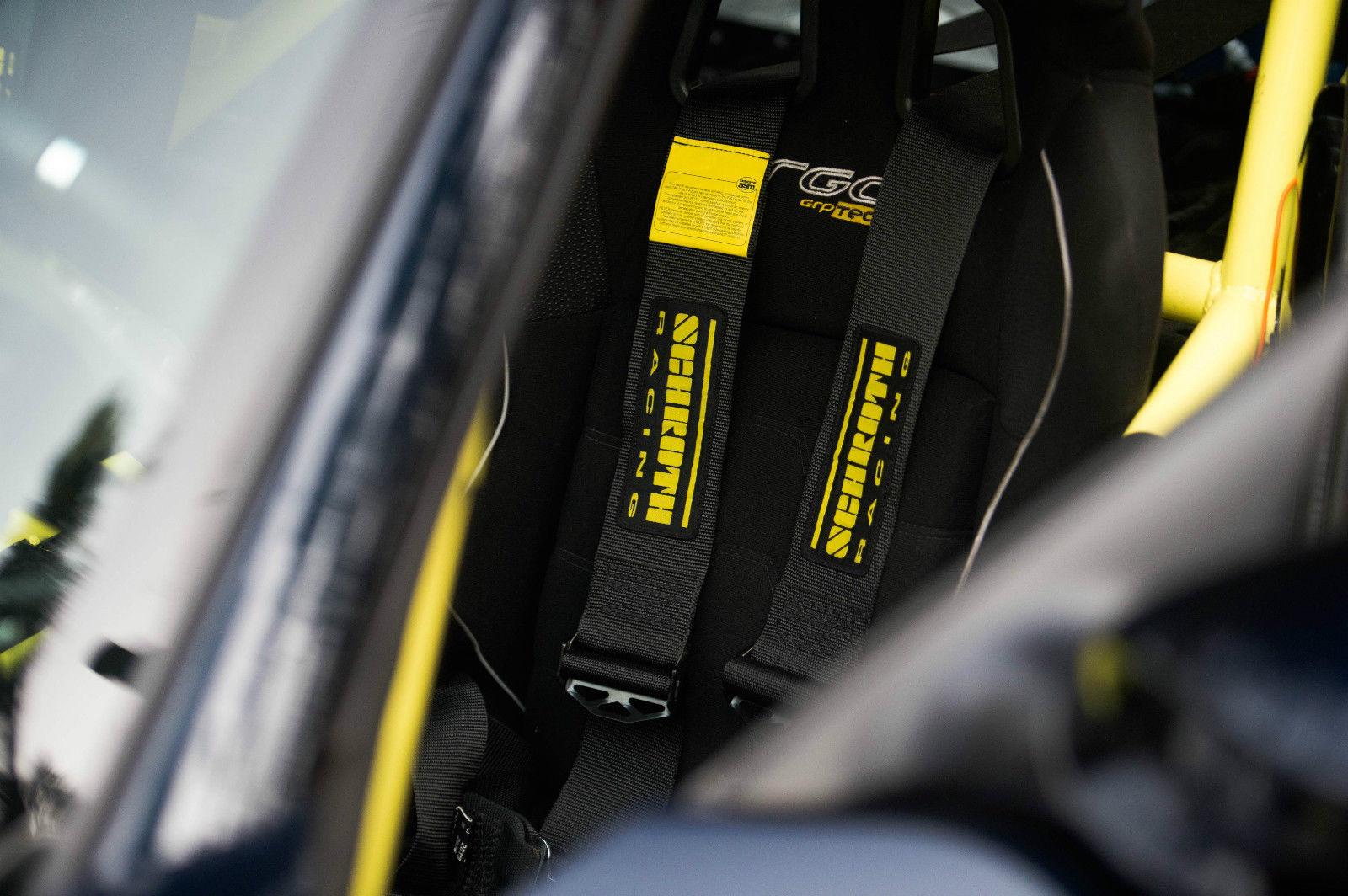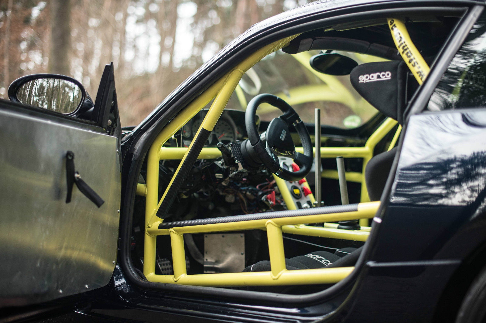 While from the outside the car looks relatively stock, the cabin has been totally stripped out and all non-essentials removed. As such, it features a custom three-spoke steering wheel, extended handbrake and gear shift levers, racing seats from Sparco as well as a complete roll cage, painted in bright yellow.