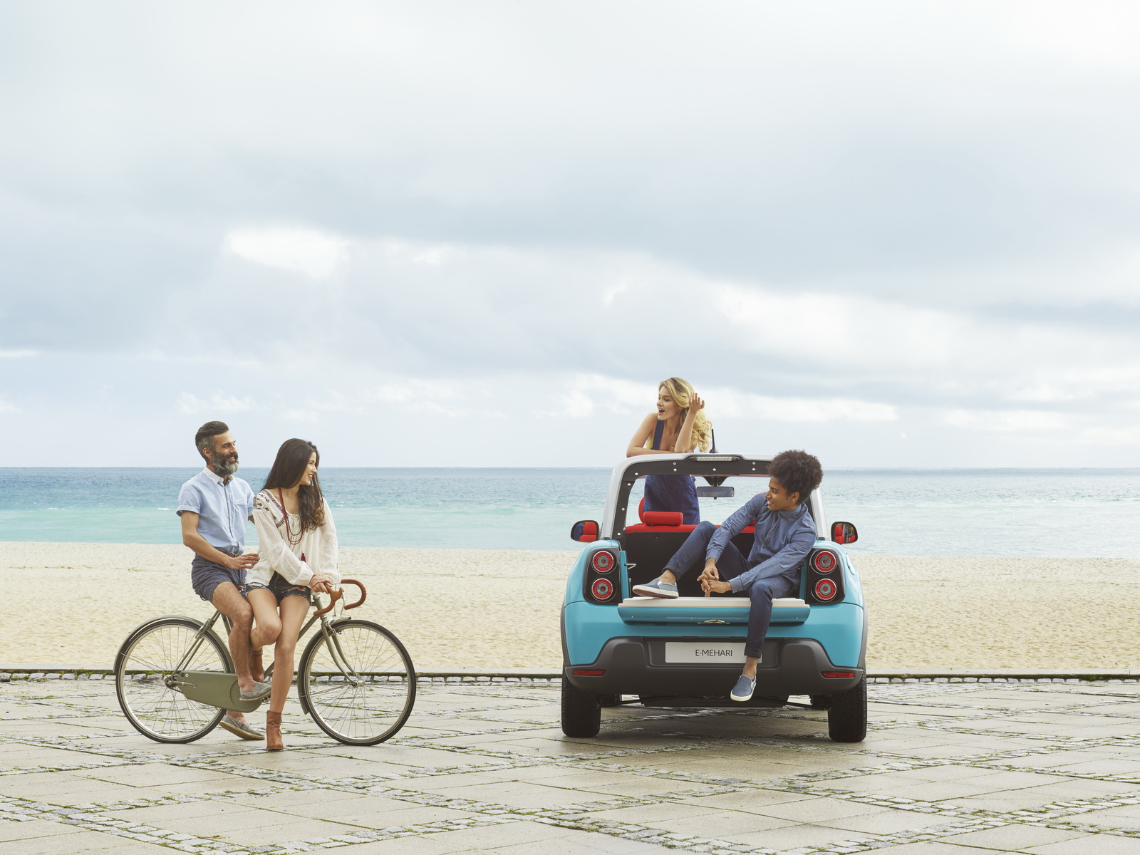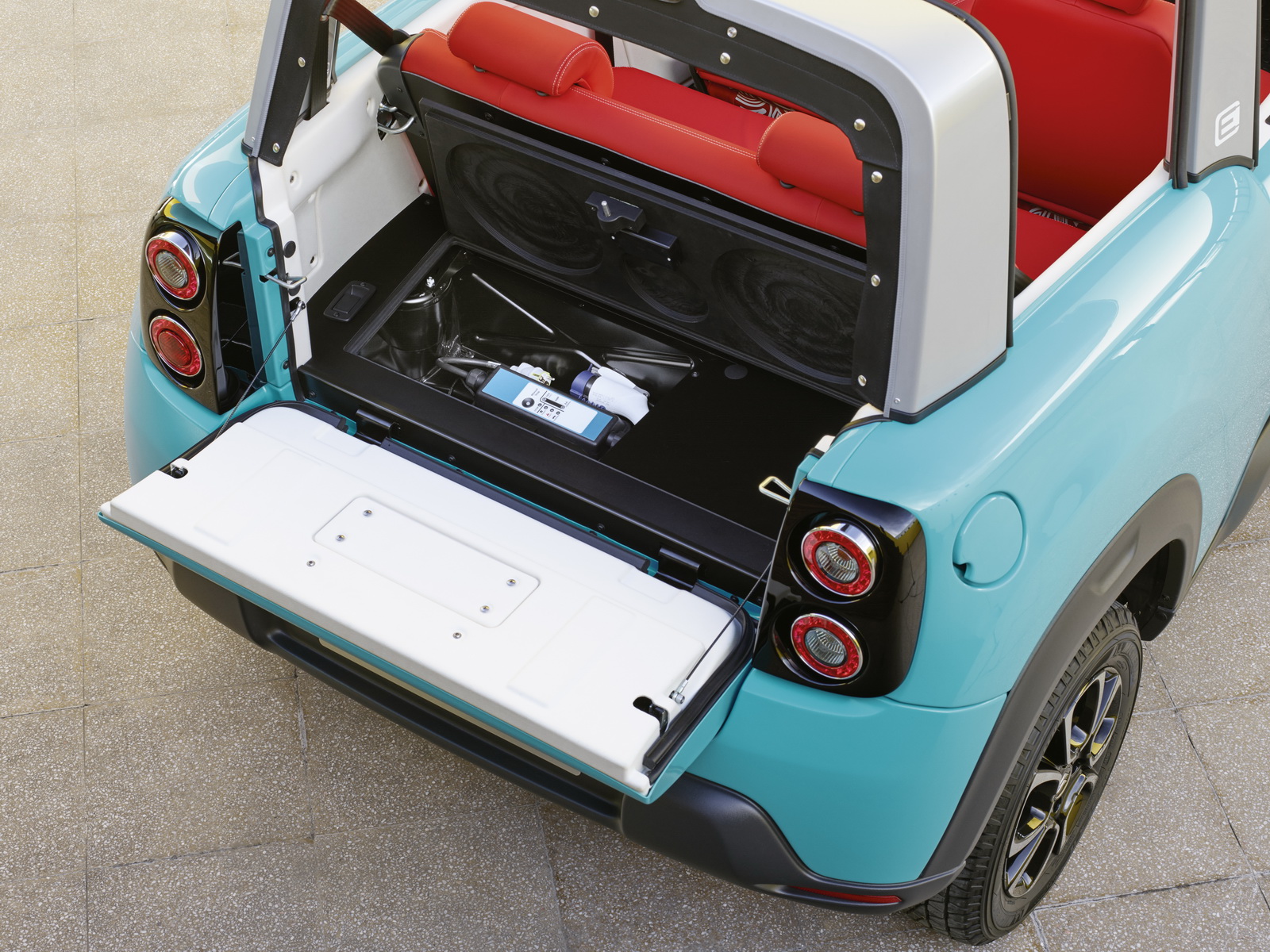 Now, the E-Mehari is actually a Bollore Blue Summer in funky clothing, it has no airbags, uses plastic body panels, and it’s powered by a 67 hp all-electric powertrain, juiced up by lithium metal polymer batteries that promise an urban driving range of 200 km (124 miles) – although LiPo batteries are not as sophisticated as Li-ions and must be recharged every 48 hours.