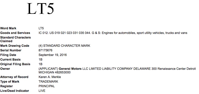 General Motors has refiled a trademark application with the United States Patent and Trademark Office for the name LT5.