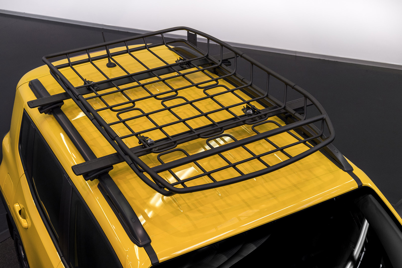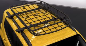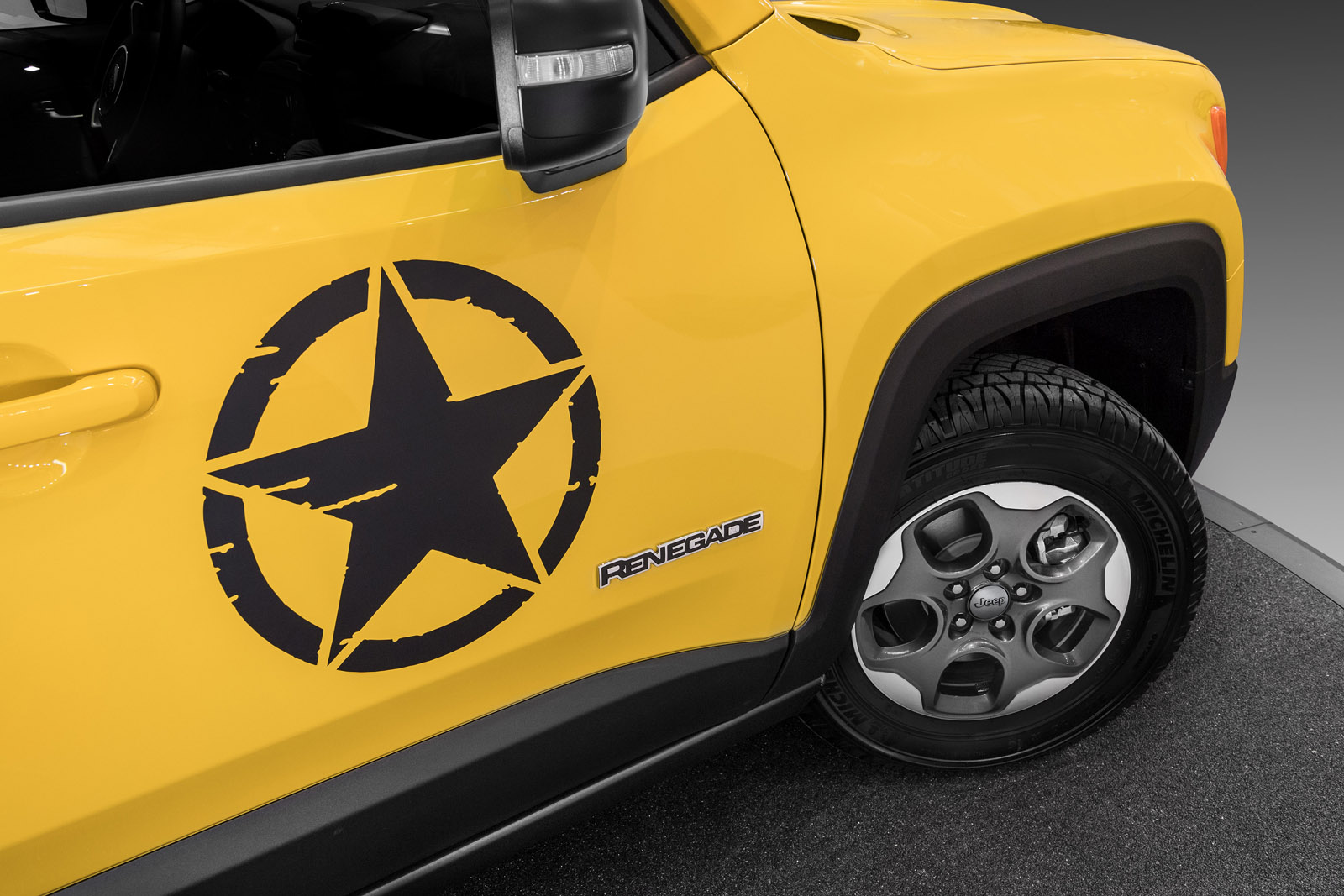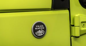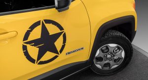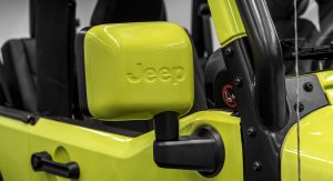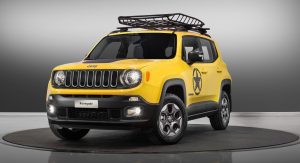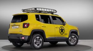 The Rubicon will be joined by a similarly “Moparized” Renegade, done up in yellow with an army-style star on the door and matte black trim. It suspension has similarly been lifted by an inch and fitted with all-season tires.