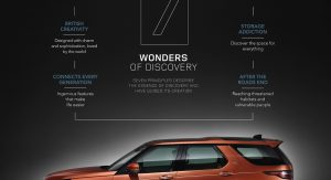 In the looks department, the new Discovery manages to reflect the model’s 27 years of heritage thanks to trademark features such as the stepped roof line and profile. It will also obviously remind you of the Discovery Vision Concept unveiled in NY back in 2014. Inside you’ve got a stadium seating configuration (each row of seats positioned higher than the one in front) that can accommodate seven full-sized adults – which is a tremendous achievement in an SUV that measures less than five meters in length (4,970mm/195 in).