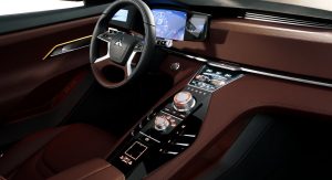 In the cabin, the GT-PHEV Concept adopts what appears to be a near-production spec interior. That means it includes a conventional four-spoke steering wheel and a dashboard incorporating dark red and black elements. Elsewhere, the cabin includes a fully digital instrument cluster which displays all the vehicle’s key information. This screen is then joined by two additional monitors on either side which use the vehicle’s wing cameras to show what’s behind. There’s also a head-up display and a panoramic glass roof.