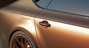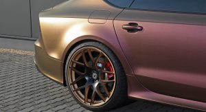 Highlighting the car’s performance add-ons is the special edition “Sparkling Berry” vinyl from Cam Shaft. Described as the “icing on the cake”, the wrap changes from brown to yellow and from gold to purple (depending on the light) for a unique appearance.