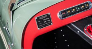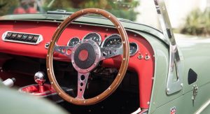 Inside, the car includes a three-spoke steering wheel with a wooden rim, a red dash and red leather seats.