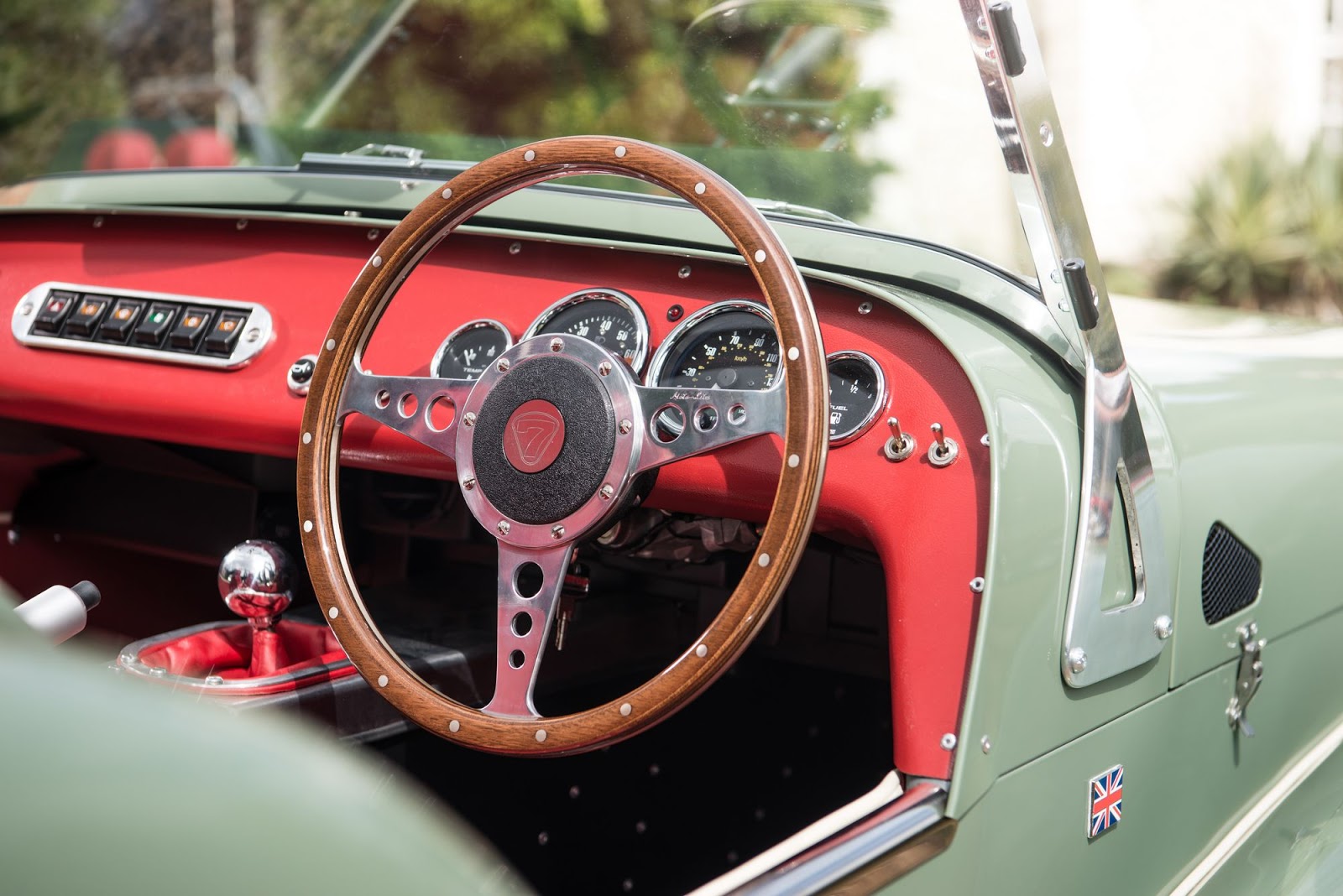 Inside, the car includes a three-spoke steering wheel with a wooden rim, a red dash and red leather seats.