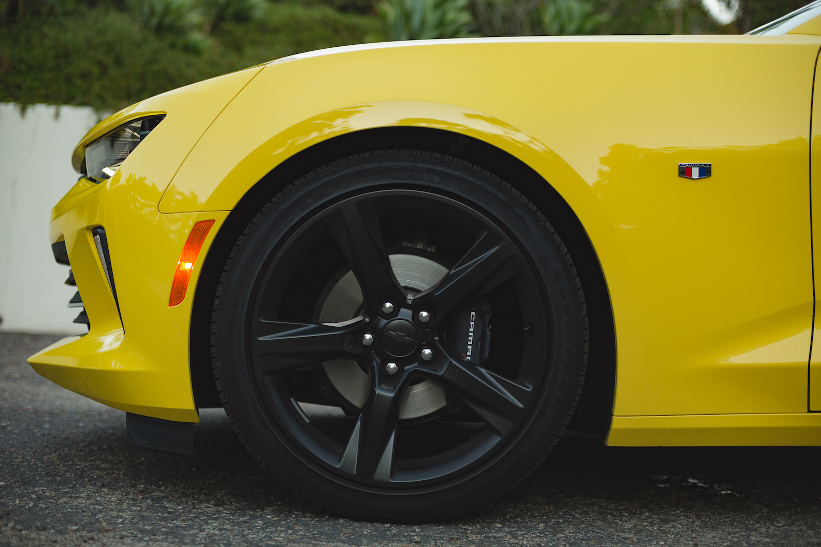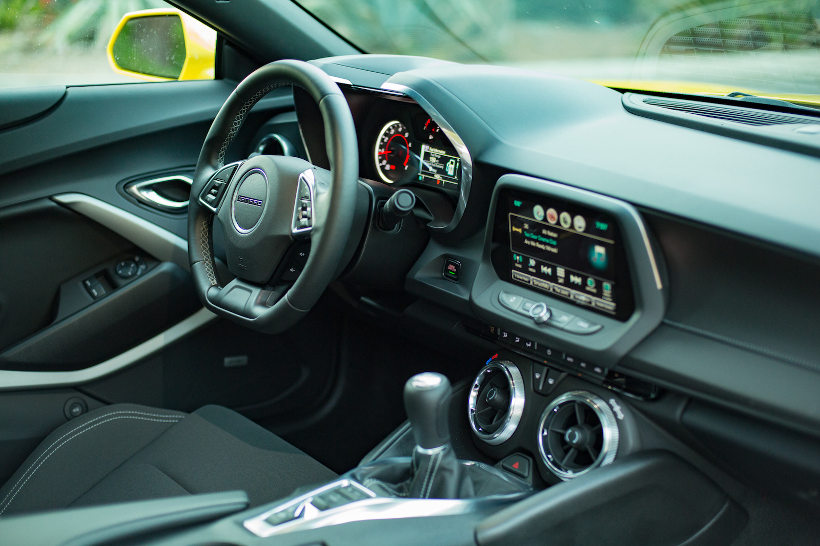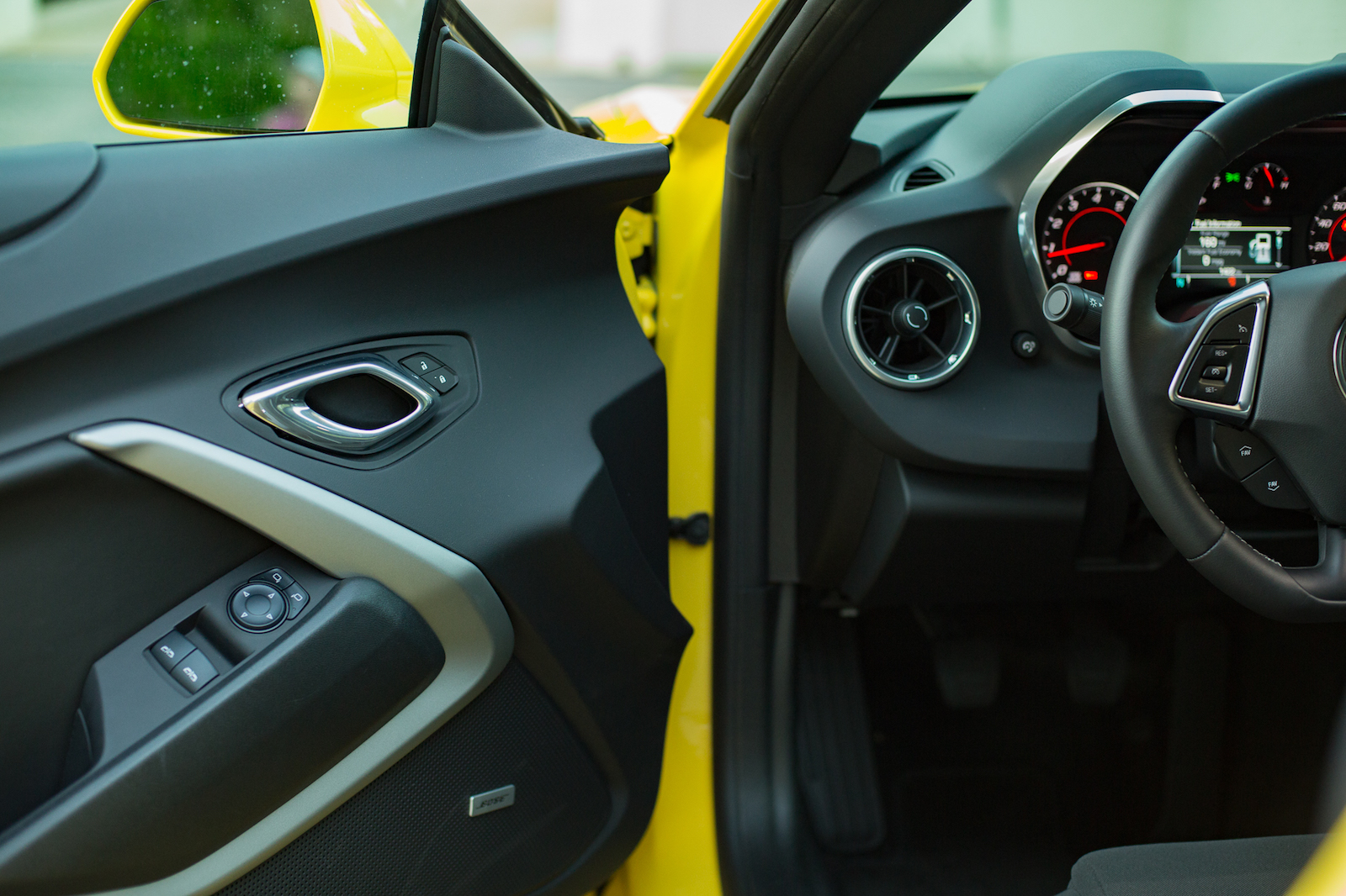 Partly because it did, and the big weight savings and trimmer dimensions over last year’s car pays dividends in more than just looks. Skip the Bumble Bee-baiting paint and the Camaro cuts a surprisingly sophisticated profile. Upsized wheels are required to fill out the wheel arches, but doing that makes the Camaro look like an up-to-date sports car, rather than a ’70s throwback, something you could probably accuse the Ford Mustang of and certainly the Dodge Challenger.