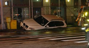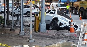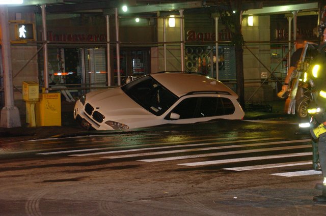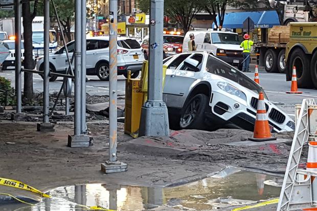 A BMW X5 was swallowed by a sinkhole in New York City’s Upper West Side on Tuesday after a water main broke.