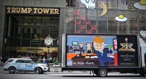 The trucks were photographed in front of Casa Bonita, PF Changs, KFC, and Hooters restaurants in Colorado and Los Angeles; the White House and Lincoln Memorial in DC; the head offices of the Scientology and Mormon churches in LA and Salt Lake City; both the Trump and Clinton presidential campaigns headquarters in New York; Facebook’s offices in Silicon Valley; the Canadian border in Buffalo; and a Whole Foods in California. They even sent one to the actual city of South Park, CO.
