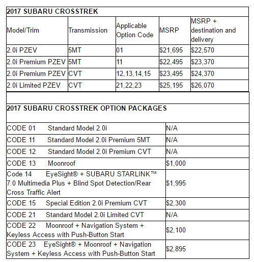 Subaru has released pricing details of the 2017 XV Crosstrek range for the American market ahead of the vehicle’s local arrival in November.