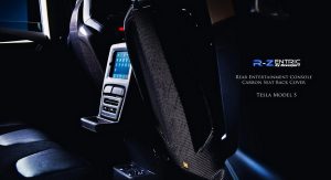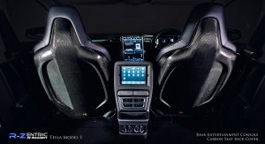The tuner created a subtle yet very brawny R Zentric visual kit for the electric car, consisting of a front splitter, rear diffuser, and new side skirts. Unlike the Model S’ design elements, which were planned to offer a low drag coefficient, RevoZport’s R Zentric package was said to have been conceived to act as a ground effect unit, allowing higher downforce. Additionally, fender flares were added, as well as a carbon trunk spoiler.