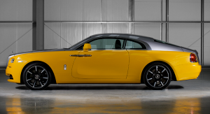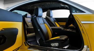Based on the Wraith fastback, this bespoke vehicle is, as you can see, decked out in yellow, with a dark grey metallic hood and roof, and polished-fascia alloys. The theme continues inside with black leather offset by yellow accents – and of course Rolls’ signature Starlight Headliner with pinhead LEDs arrayed to emulate the constellations.