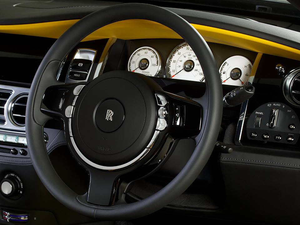 Based on the Wraith fastback, this bespoke vehicle is, as you can see, decked out in yellow, with a dark grey metallic hood and roof, and polished-fascia alloys. The theme continues inside with black leather offset by yellow accents – and of course Rolls’ signature Starlight Headliner with pinhead LEDs arrayed to emulate the constellations.