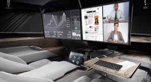 The futuristic styling continues inside, where focus was placed on transforming it into a luxurious office on wheels. The study has no front passenger seat, which was dropped in favor of two 90-percent transparent, 19-inch transparent displays that can be combined into a single 38-inch screen, once they fold down from the roof. These can be paired with the built-in computer with keyboard and mouse, and on-board tablet.