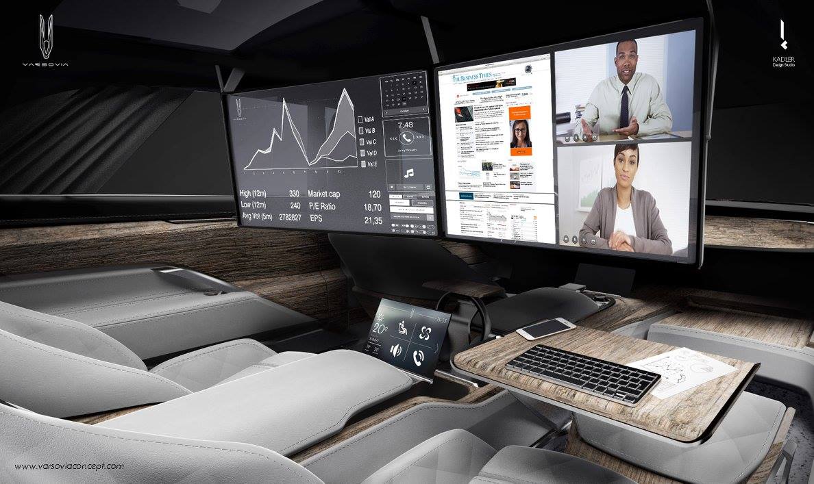 The futuristic styling continues inside, where focus was placed on transforming it into a luxurious office on wheels. The study has no front passenger seat, which was dropped in favor of two 90-percent transparent, 19-inch transparent displays that can be combined into a single 38-inch screen, once they fold down from the roof. These can be paired with the built-in computer with keyboard and mouse, and on-board tablet.